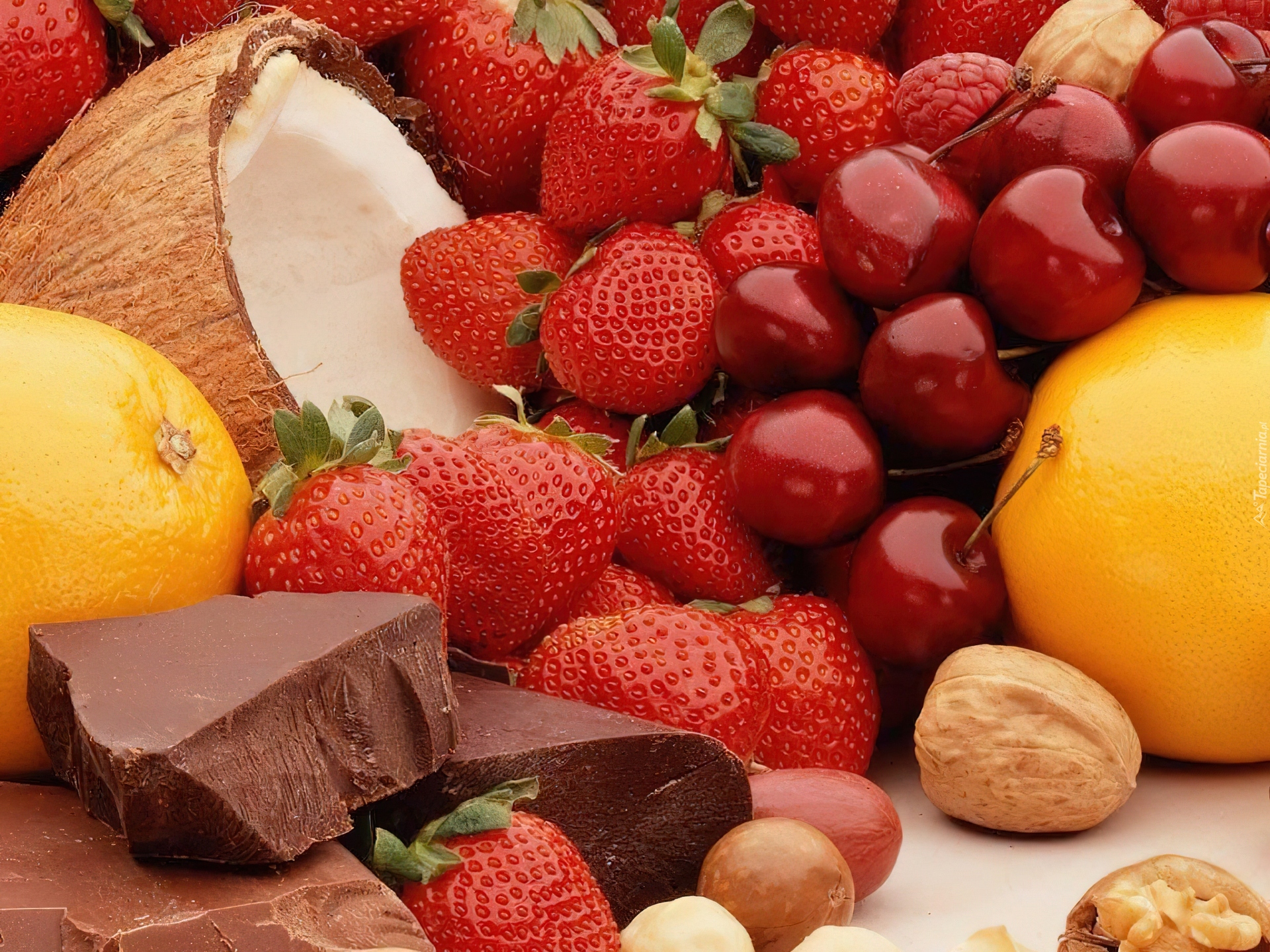 Edytor tapety: Różne, Owoce, Orzechy, Kawałki, Czekolady
