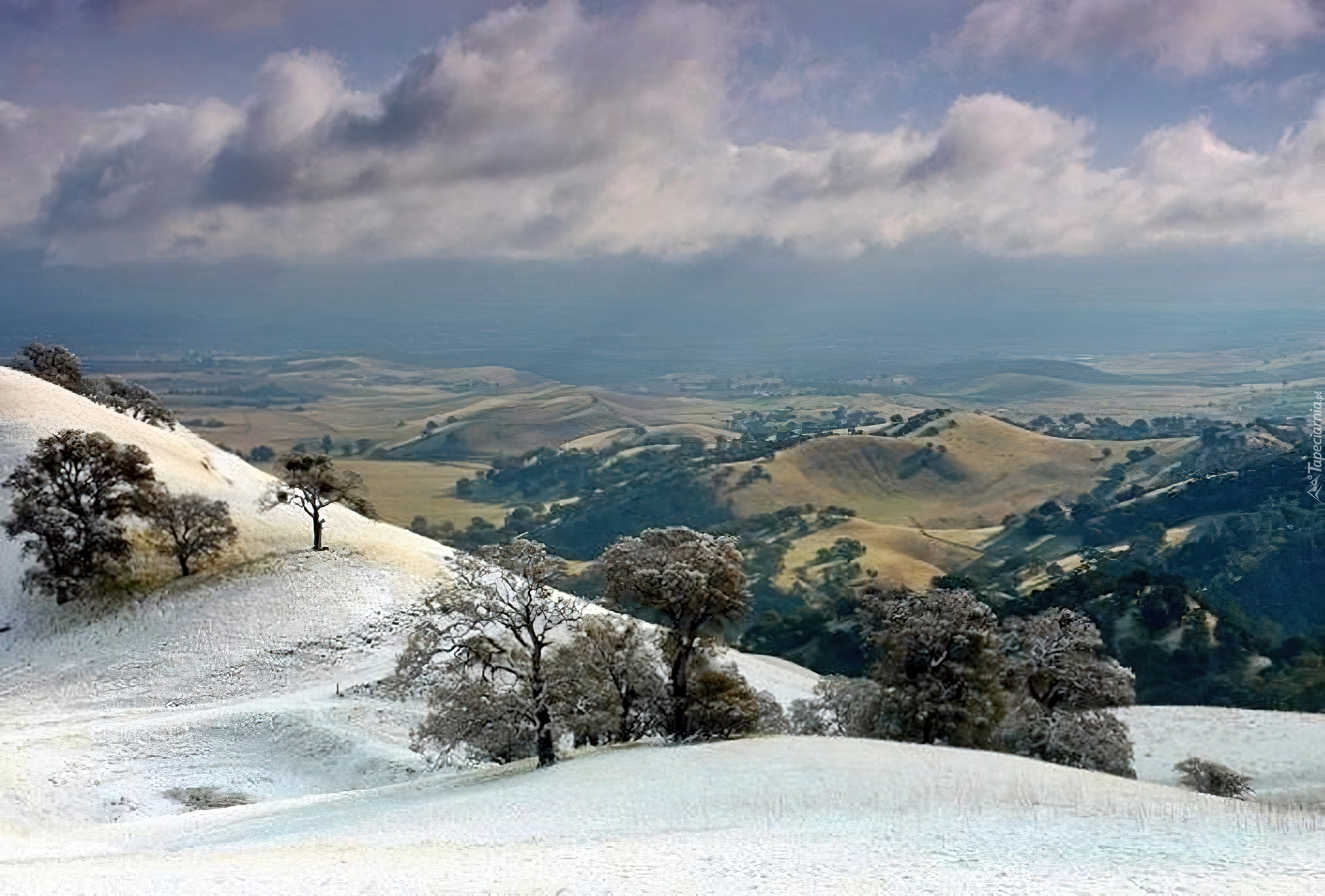 Edytor tapety: Pagórki, Drzewa, Chmury