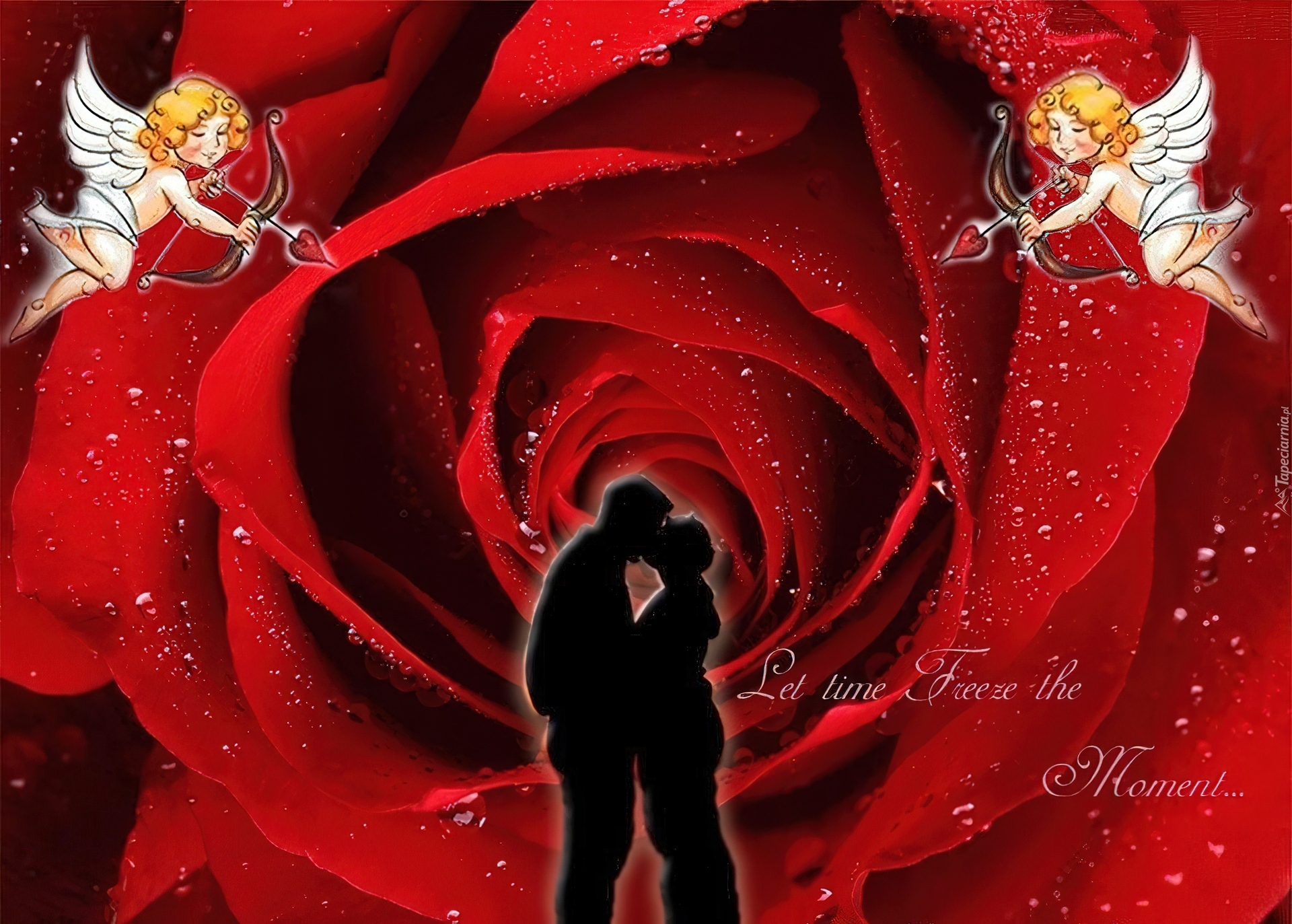 Edytor tapety: Zakochani, Dwa, Amorki, Pąk, Czerwonej, Róży
