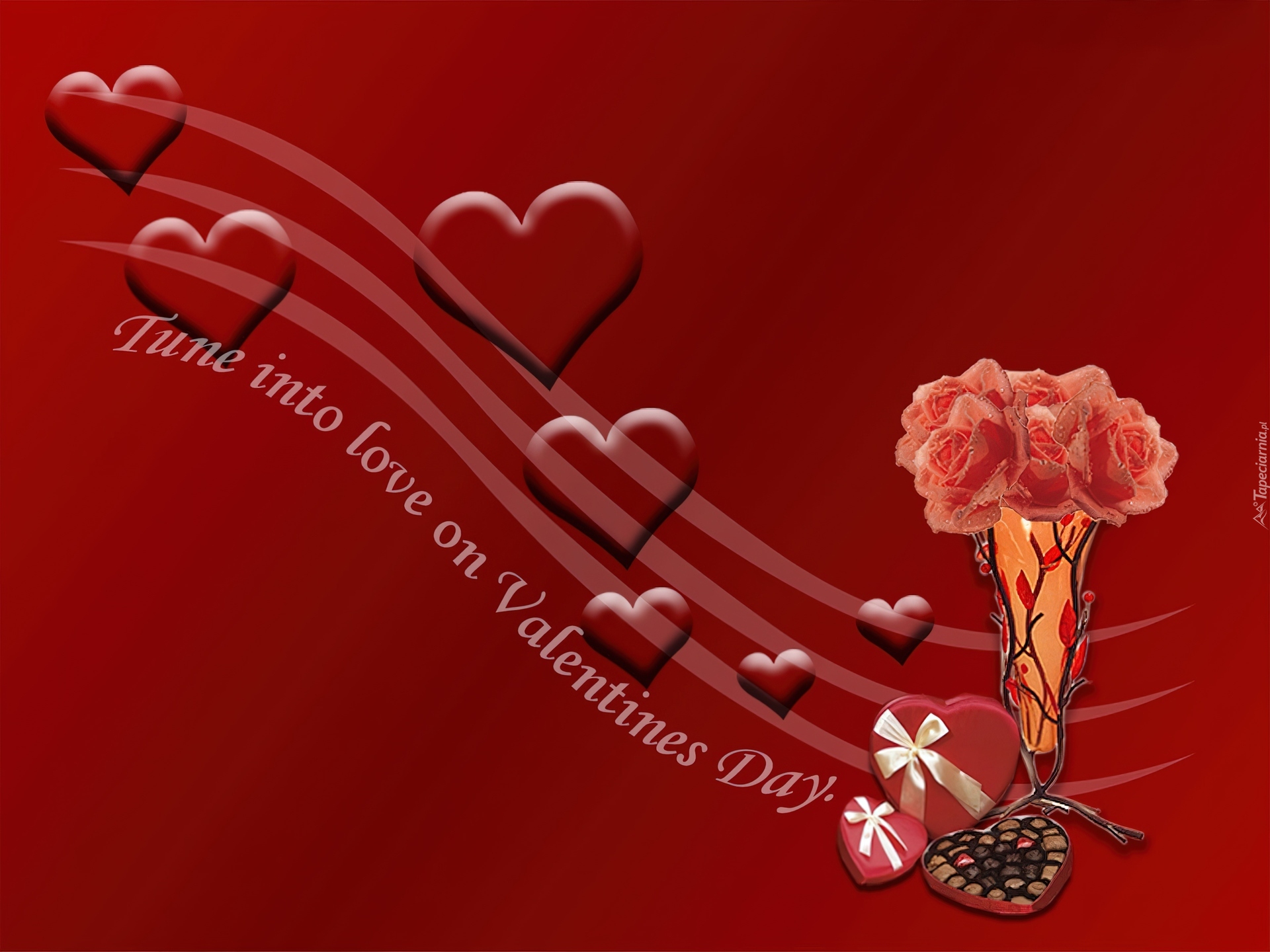 Edytor tapety: Czerwone, Serduszka, Bukiecik, Róż, Walentynki, Miłość