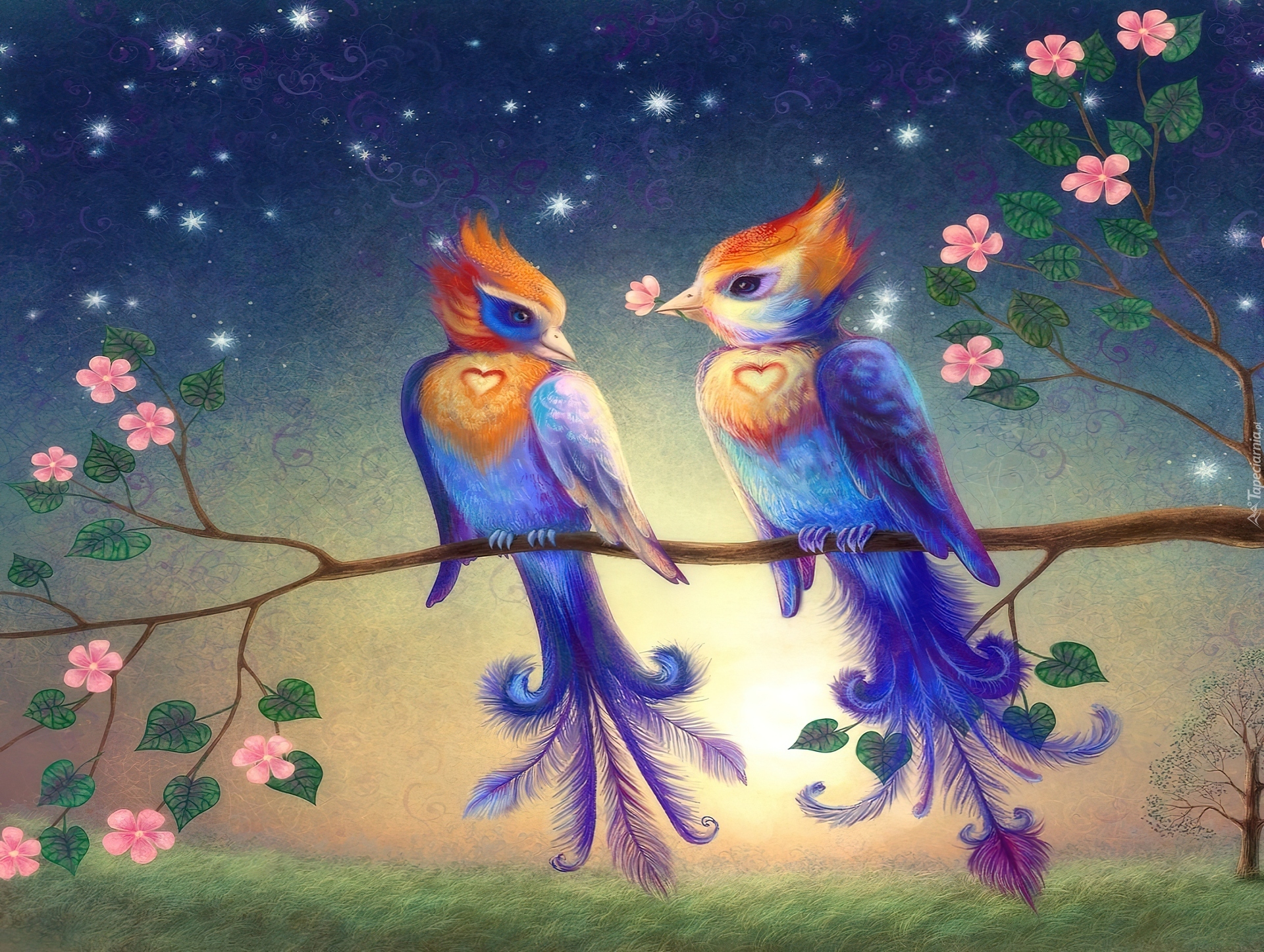 Edytor tapety: Dwa, Kolorowe, Ptaszki, Miłość