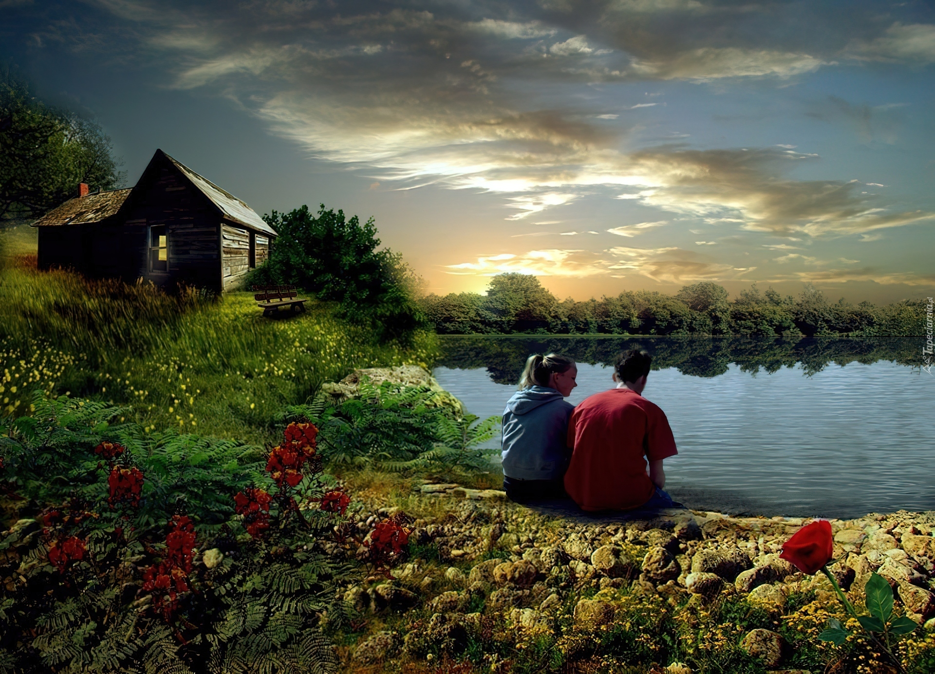 Edytor tapety: Zachód, Słońca, Zakochani, Jezioro, Domek