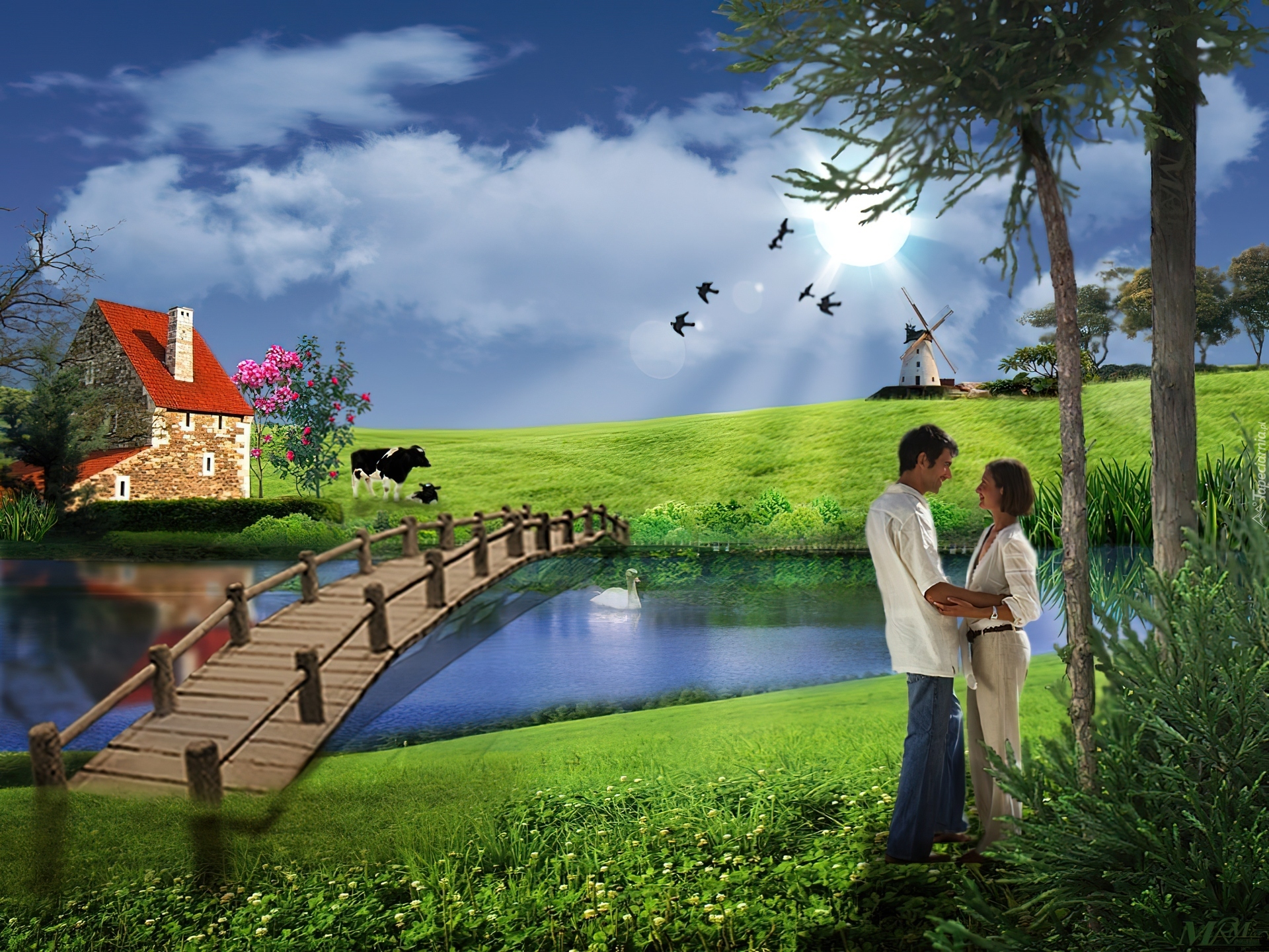 Edytor tapety: Zakochani, Łąka, Rzeczka, Kładka, Domek