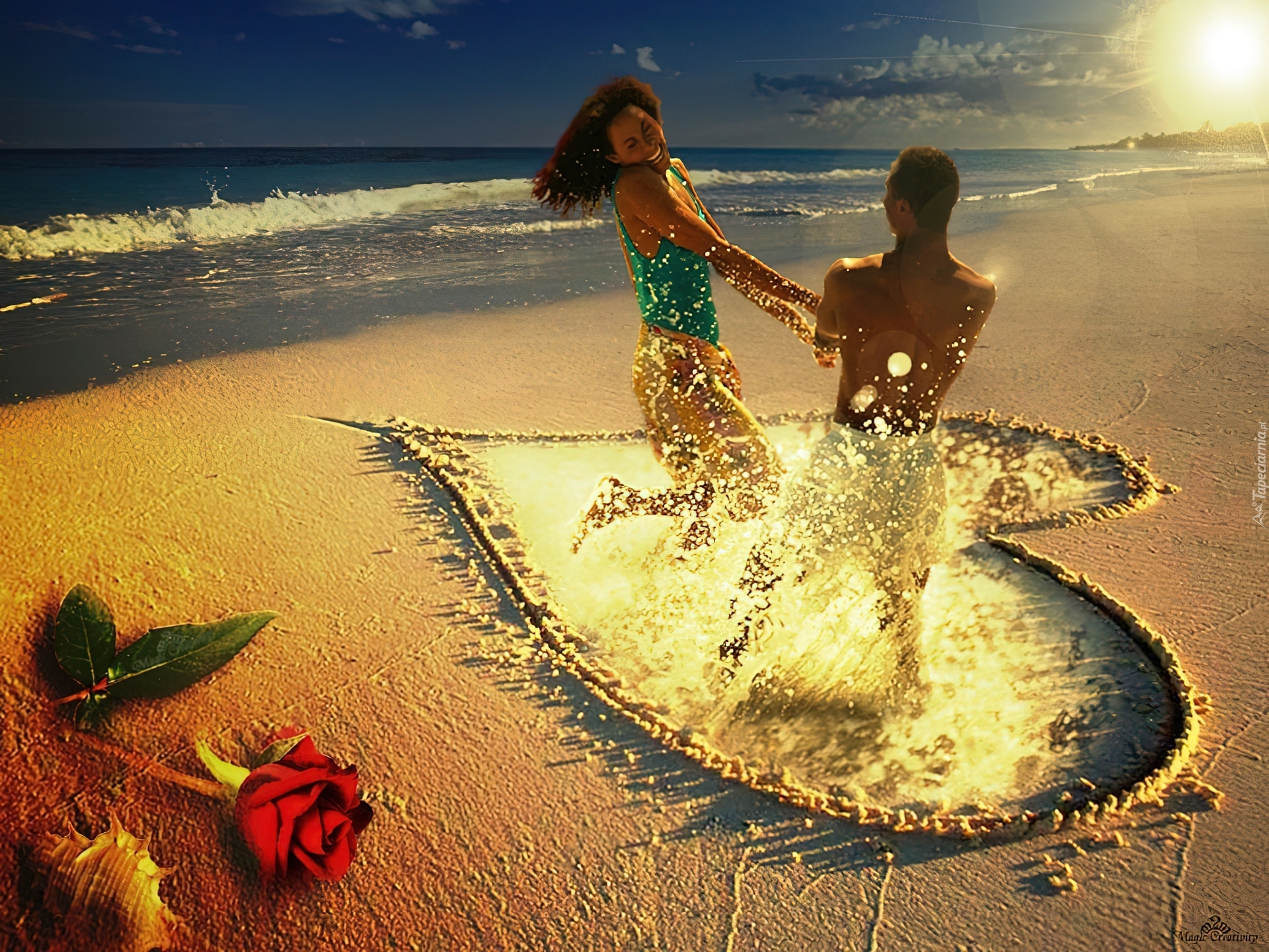 Edytor tapety: Zakochani, Serce, Piasek, Plaża, Morze, Róża