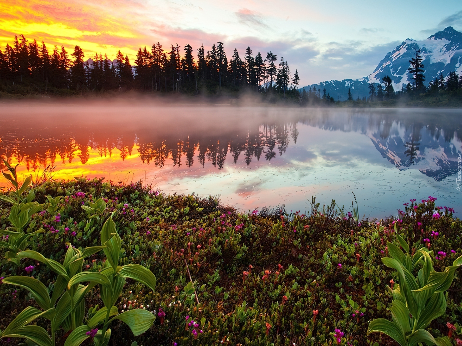 Edytor tapety: Jezioro, Kwiaty, Las, Mgła