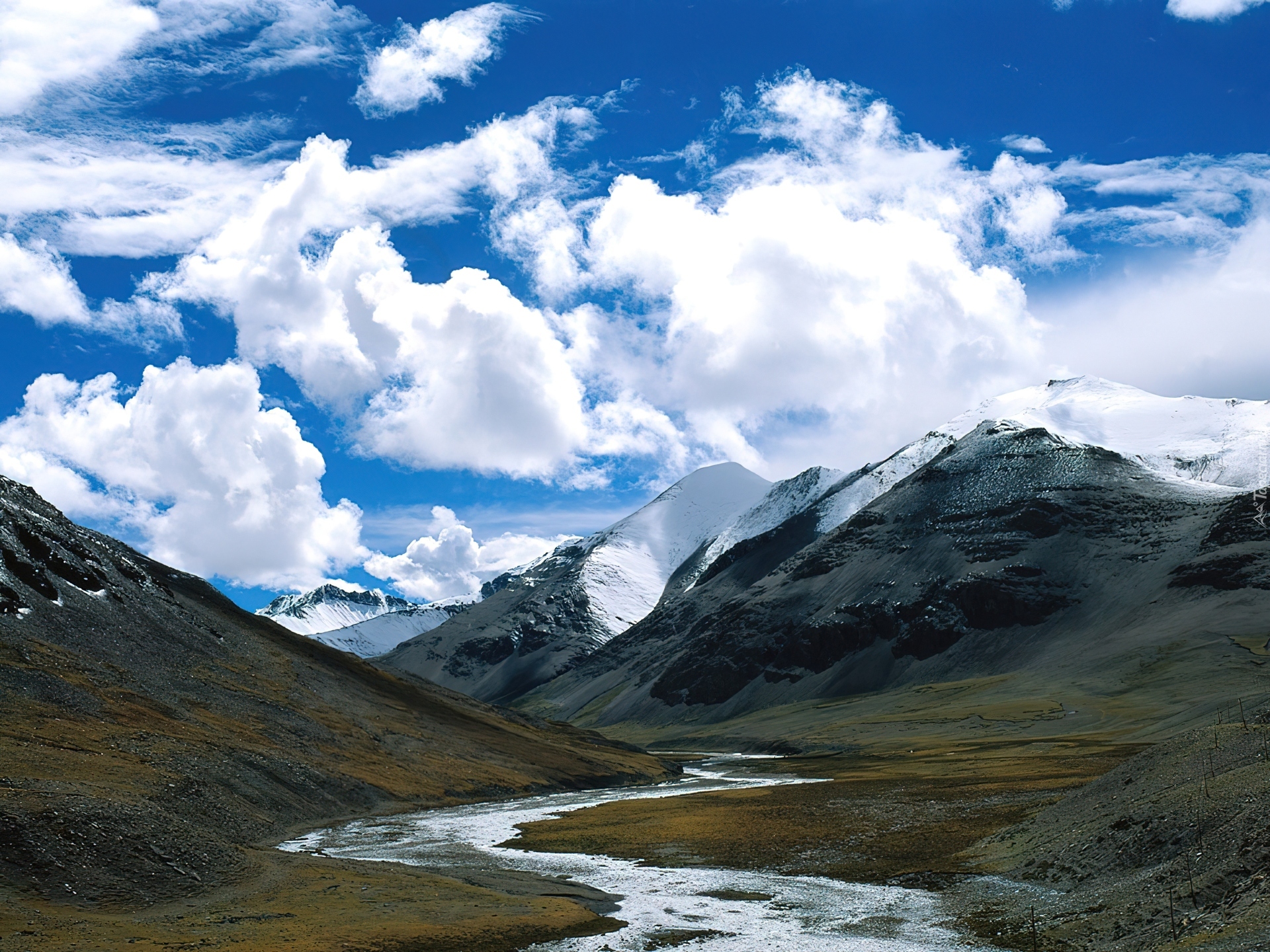 Edytor tapety: Szczyty, Gór, Rzeczka, Białe, Obłoczki, Niebo