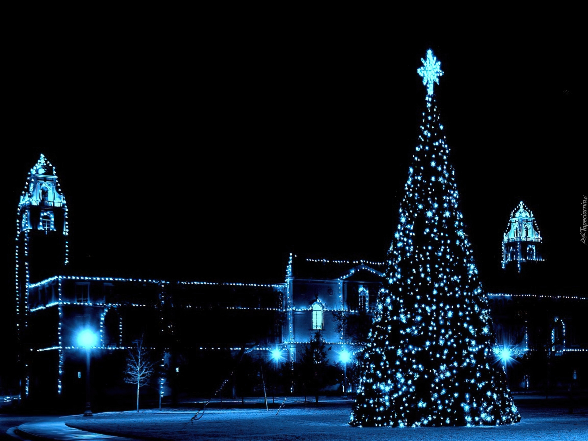 Edytor tapety: Niebieska, Choinka, Dom
