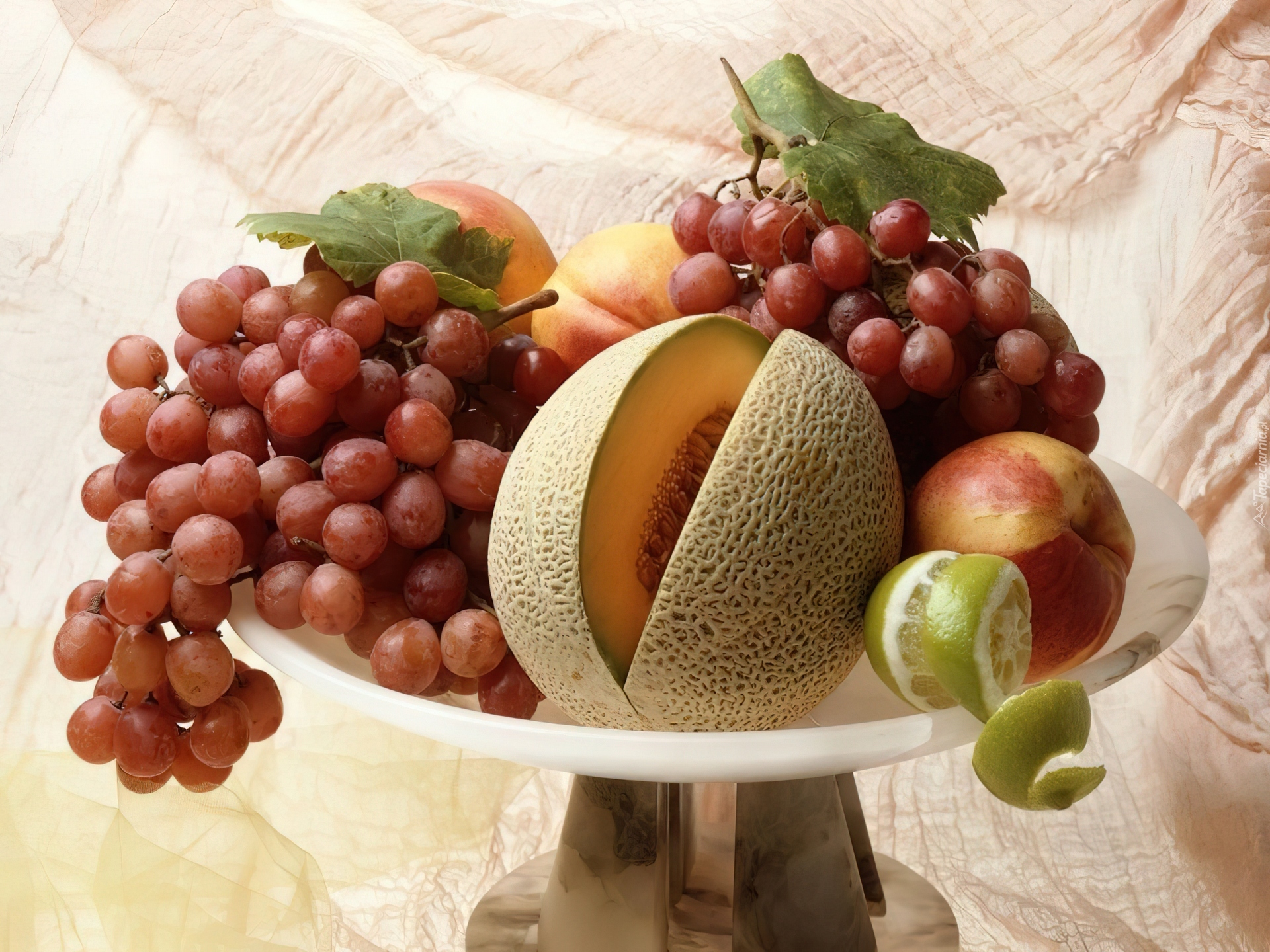 Edytor tapety: Smaczne, Owoce, Winogrona, Brzoskwinie, Melon