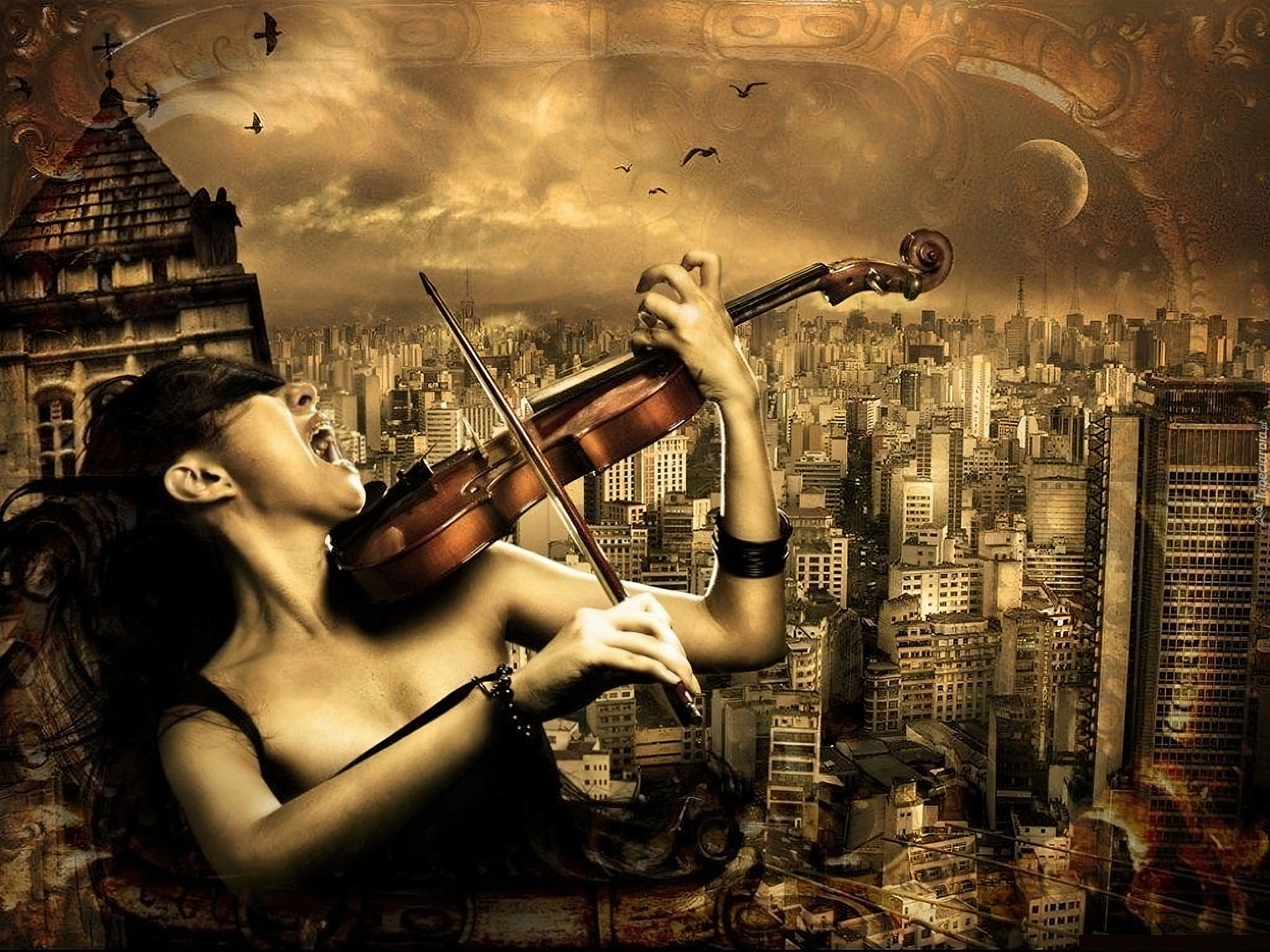 Edytor tapety: Kobieta, Skrzypce, Miasto