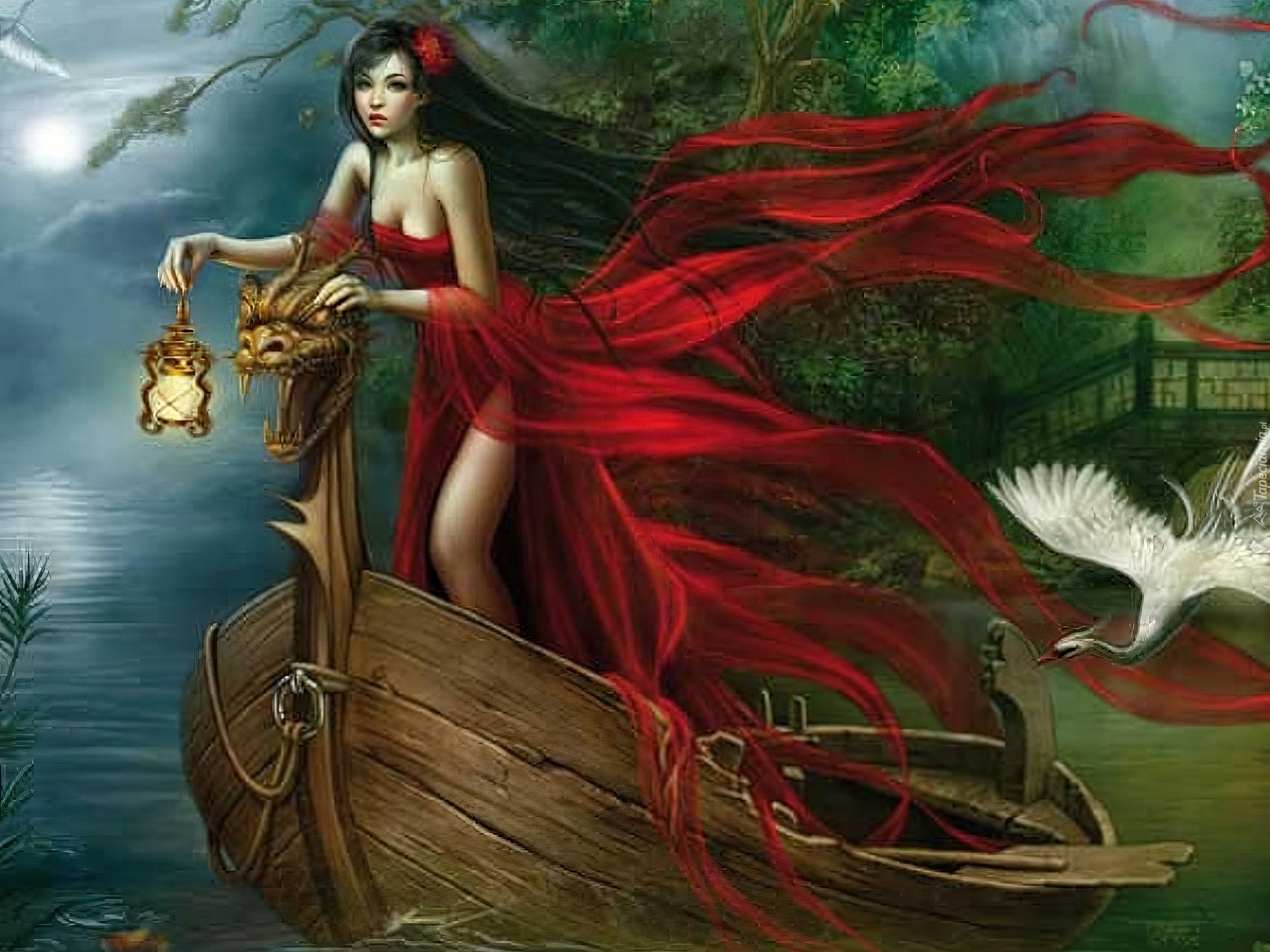 Edytor tapety: Kobieta, Czarwona, Suknia, Ptak