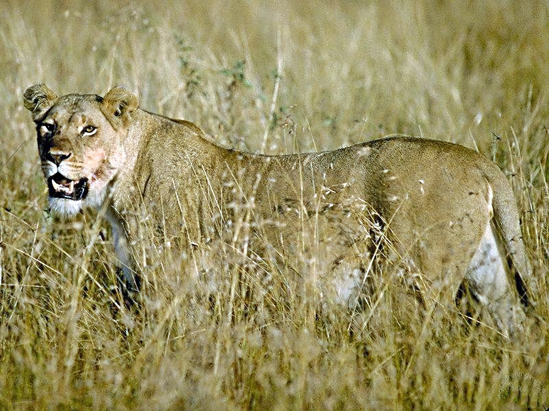 Edytor tapety: Lwica, Polowanie, Trawa