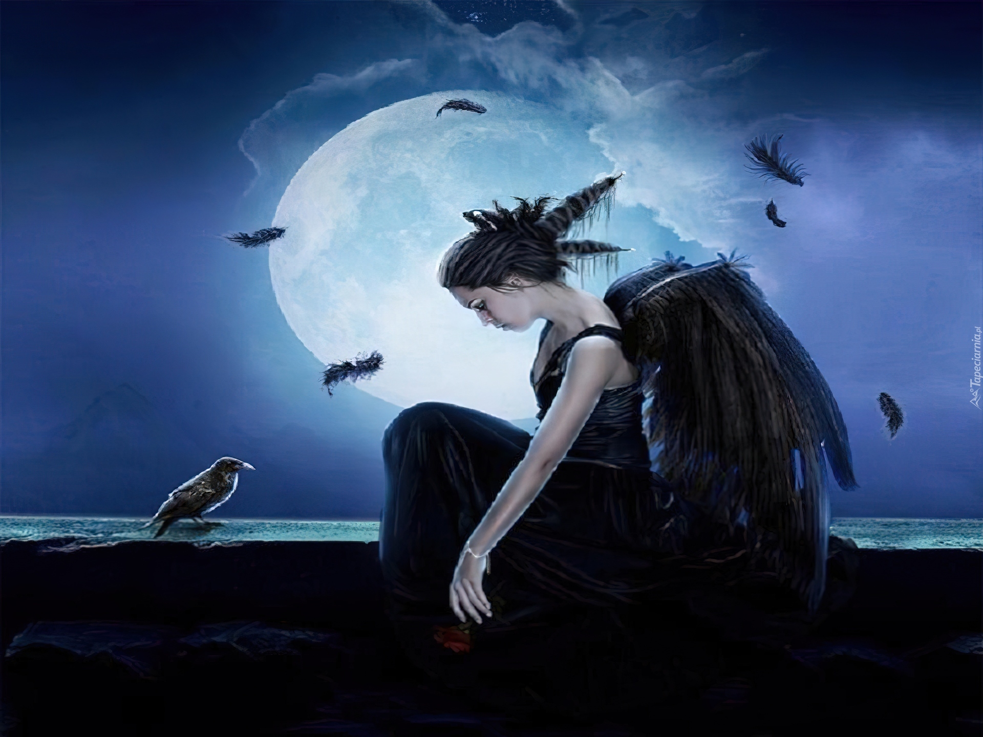 Edytor tapety: Kobieta, Czarne, Skrzydła, Księżyc