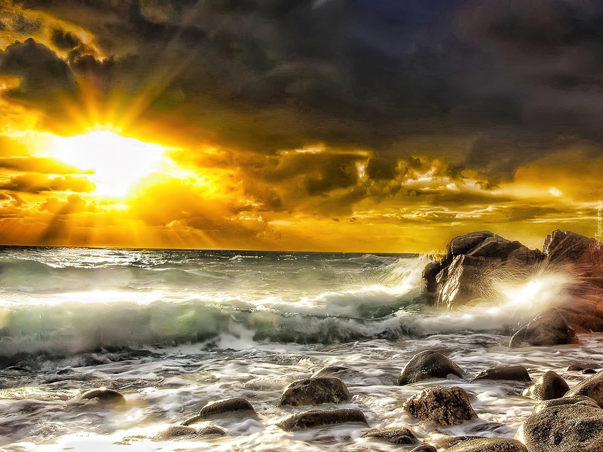 Edytor tapety: Zachód, Słońca, Fale, Morze, Skały