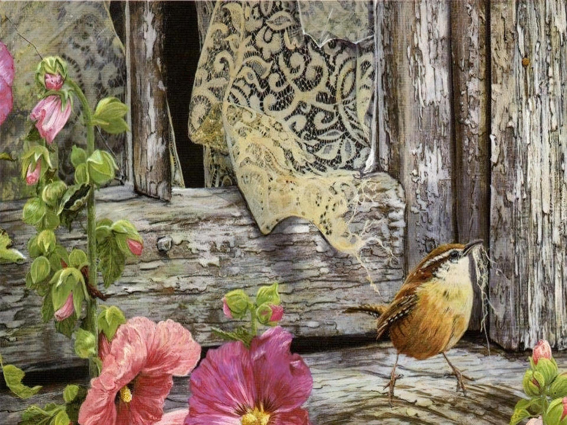 Edytor tapety: Okno, Wróbel, Kwiaty