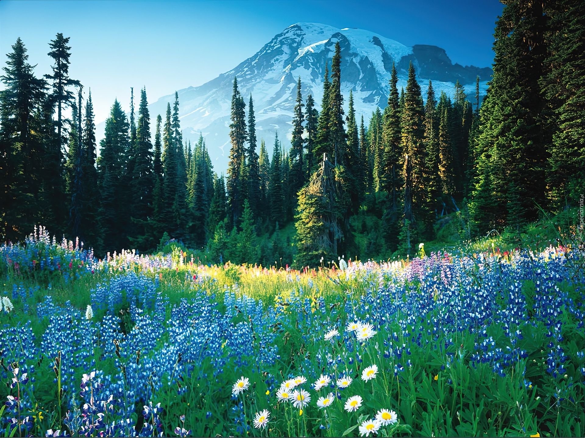Edytor tapety: Łąka, Kwiaty, Góry