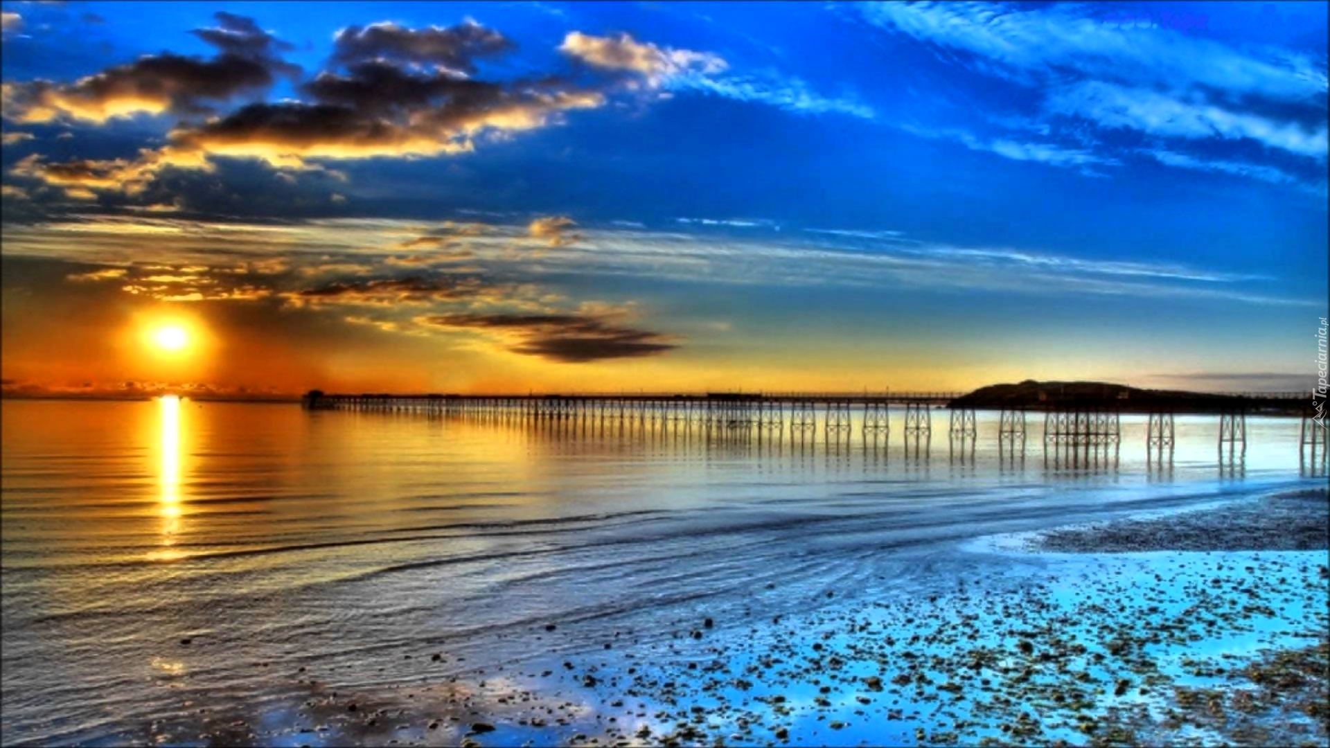 Edytor tapety: Zachód, Słońca, Chmury, Morze, Plaża, Molo