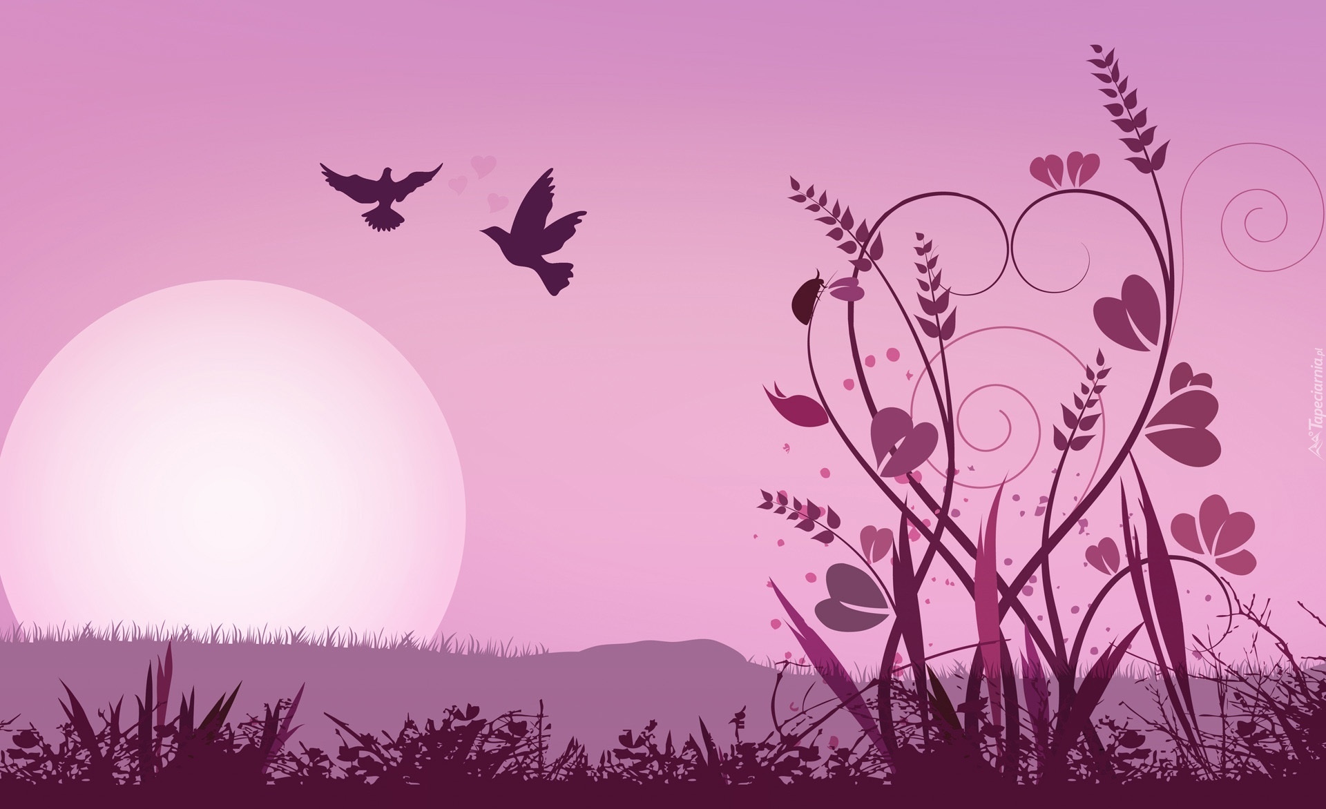 Edytor tapety: Fioletowe, Ptaszki, Zachód, Słońca, Listki