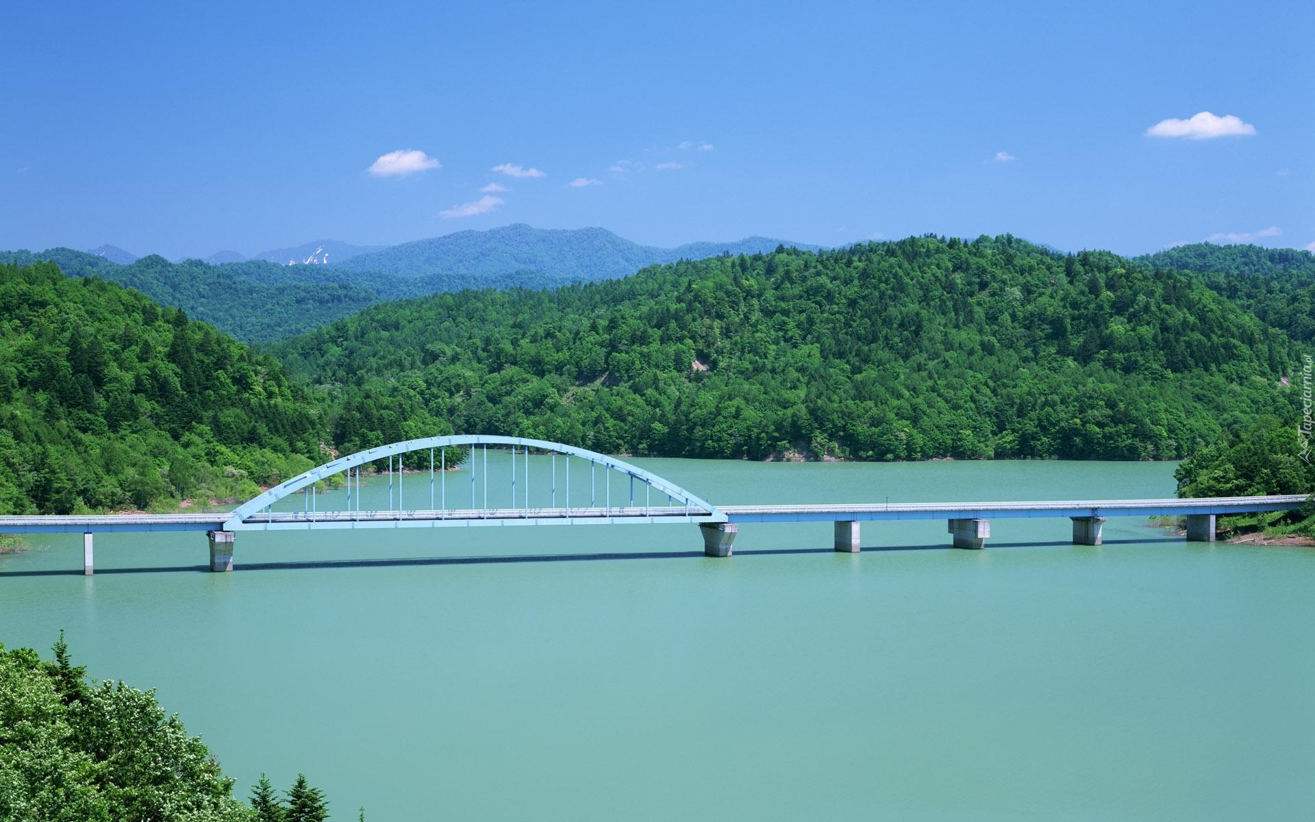 Edytor tapety: Zielone, Wzgórza, Rzeka, Most