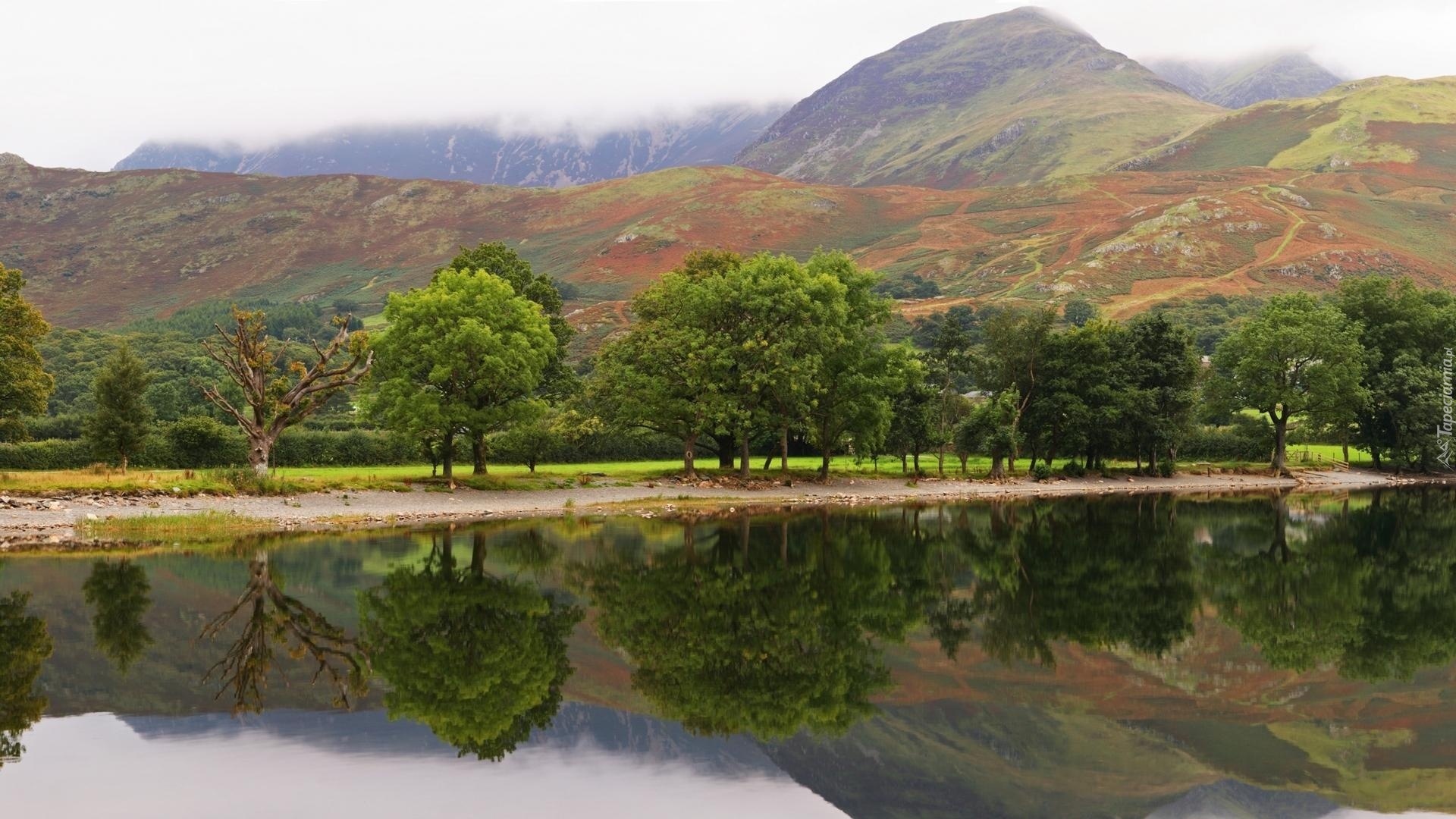 Edytor tapety: Odbicie, Drzew, Jezioro, Góry