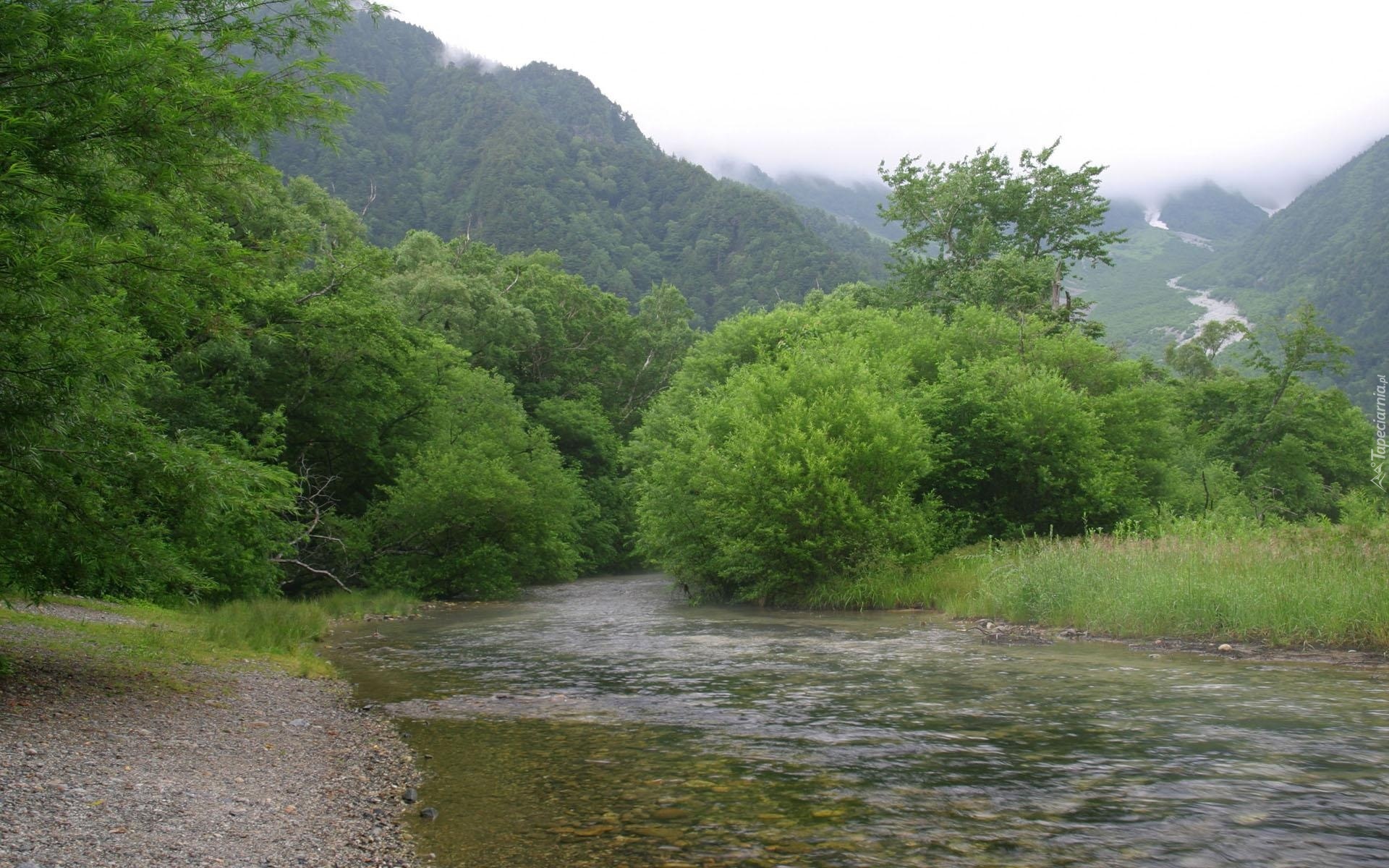 Edytor tapety: Zielone, Drzewa, Krzewy, Szczyty, Gór, Rzeka