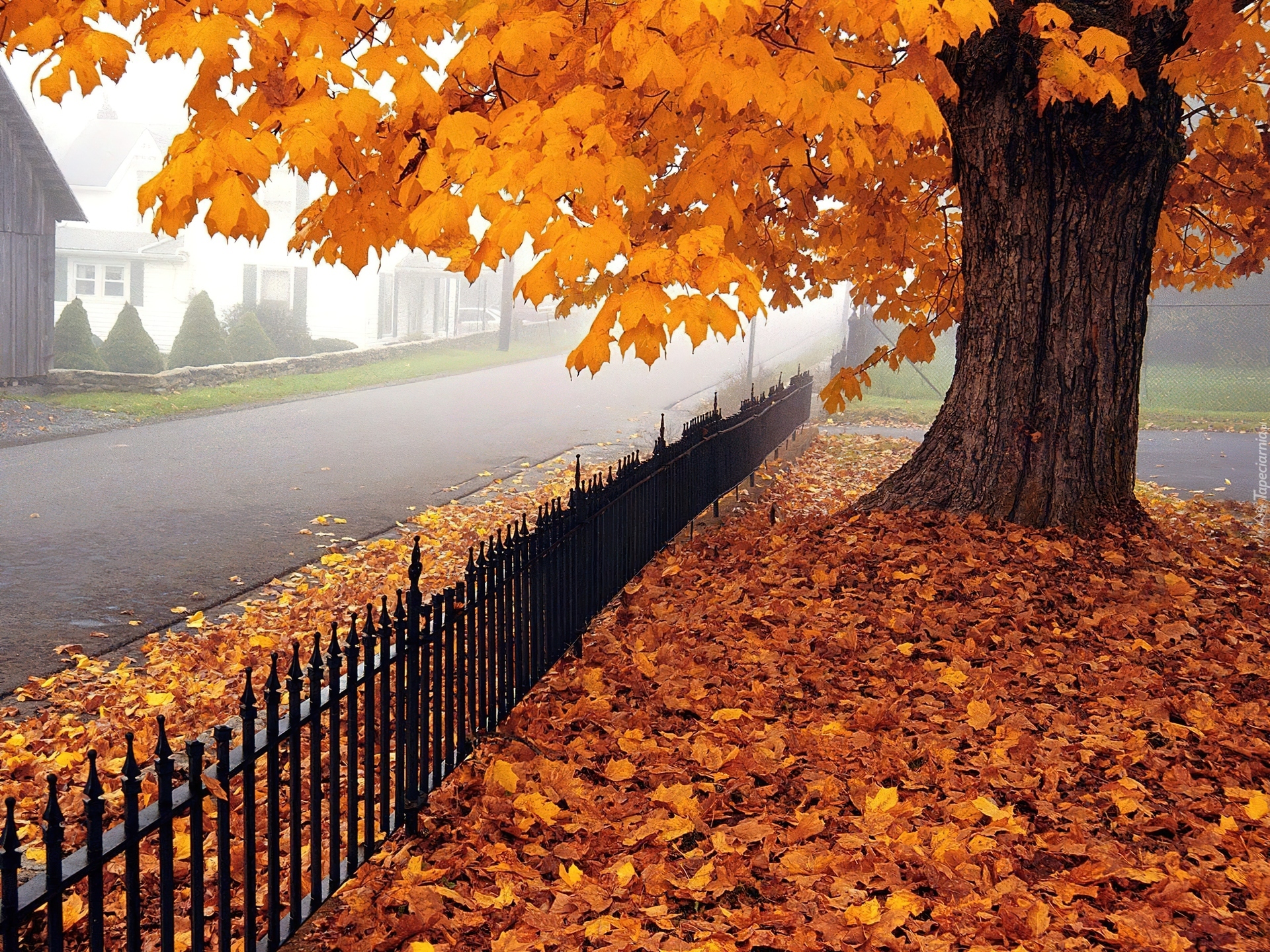 Edytor tapety: Jesień, Żółte, Liście, Drzewo, Ogrodzenie, Ulica