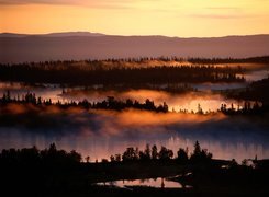 Edytor tapety: Ciemny, Las, Jeziorka, Wzgórza, Zachód, Słońca