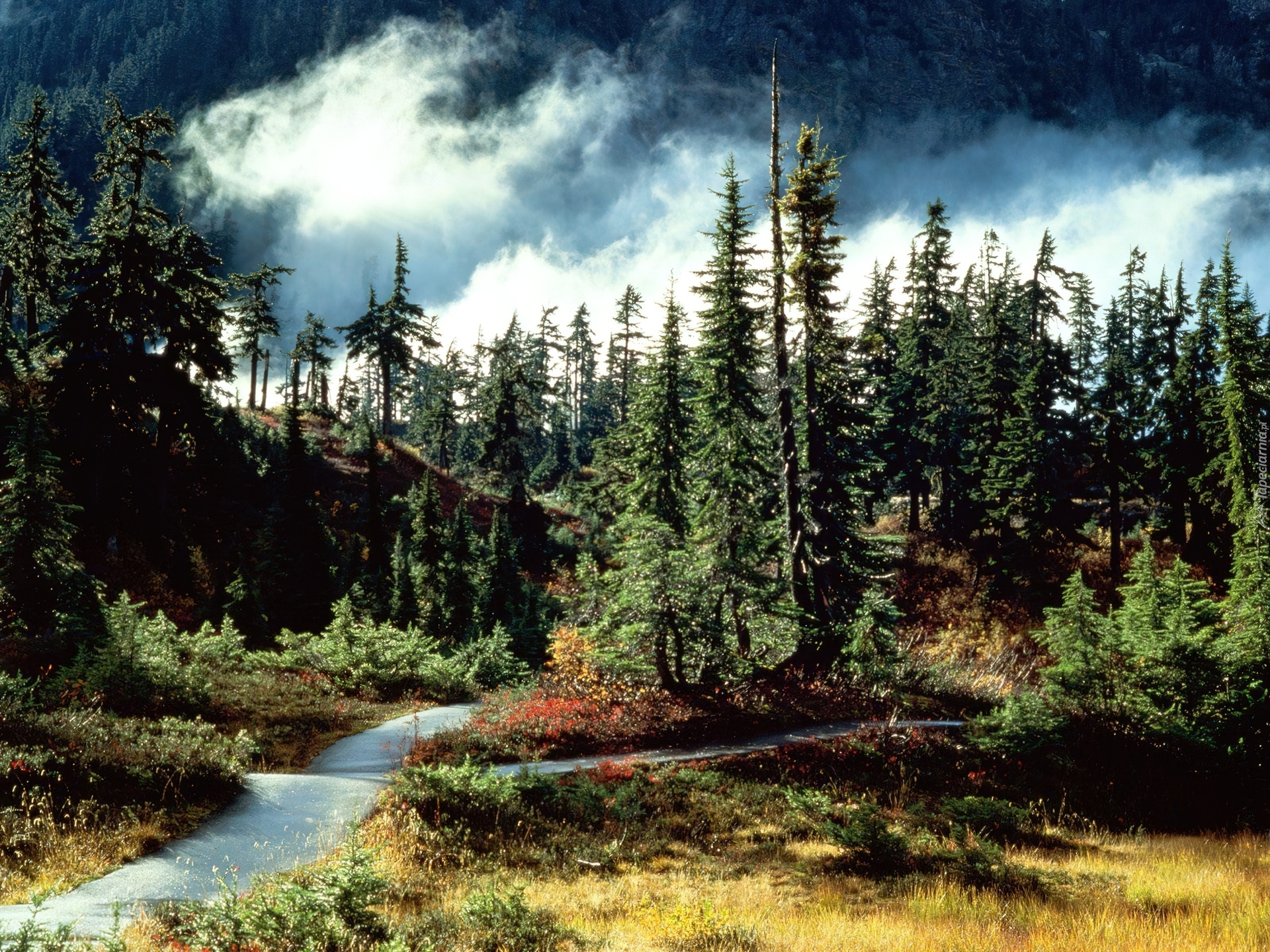 Edytor tapety: Zielone, Iglaki, Wąska, Dróżka, Zachmurzone, Niebo