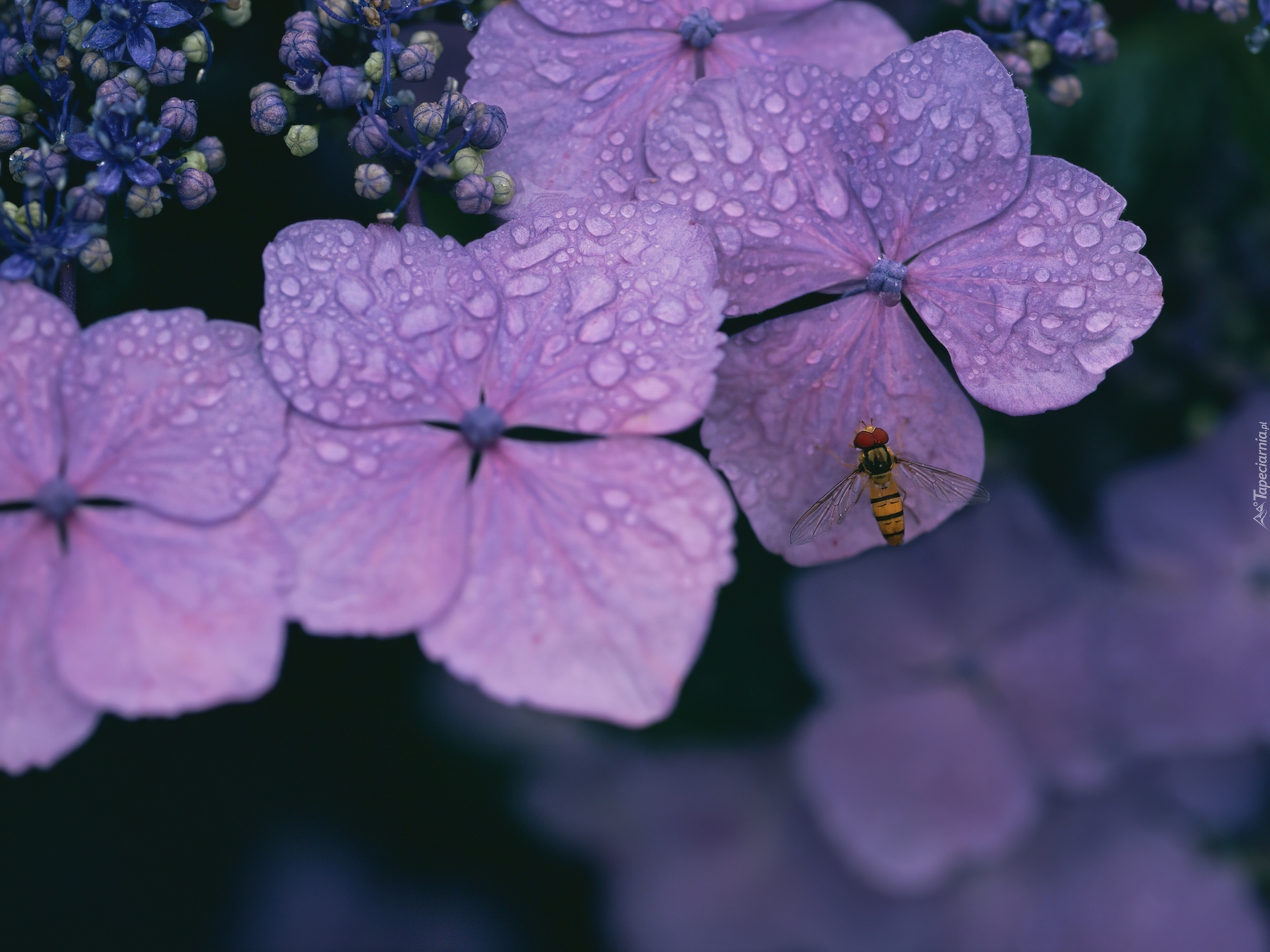 Edytor tapety: Fioletowe, Kwiatki, Krople, Wody, Mucha