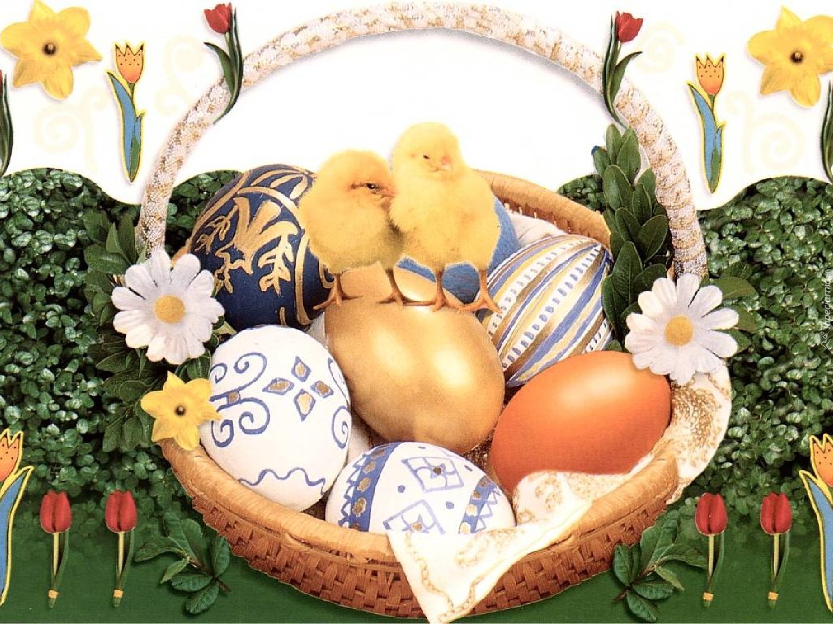 Edytor tapety: Dwa, Kurczaczki, Koszyk, Pisanki, Wielkanoc