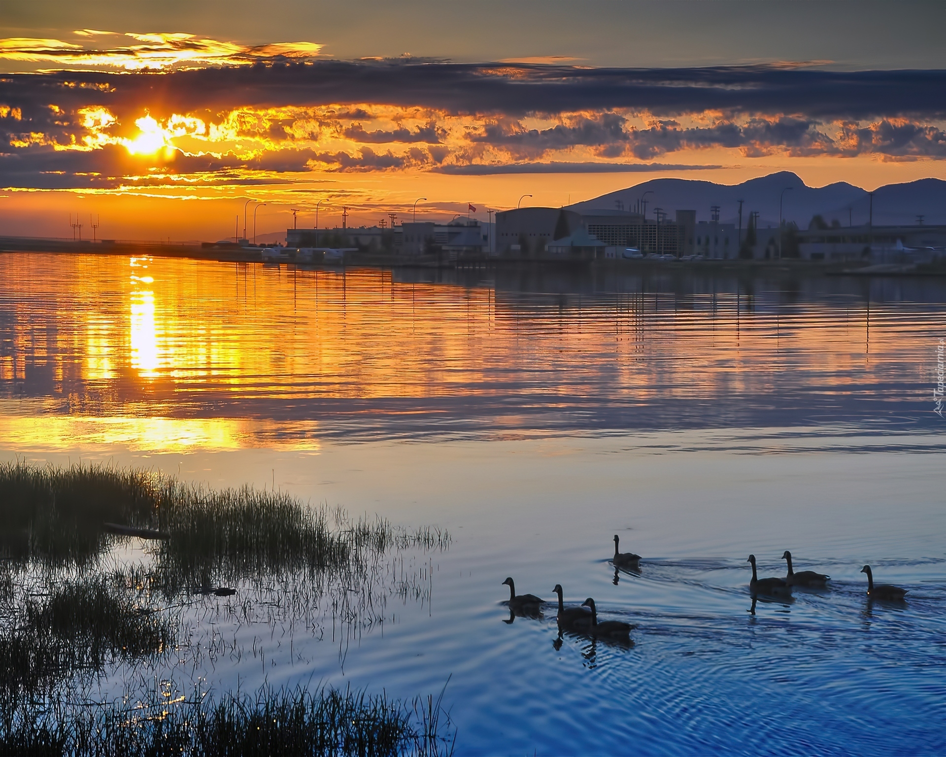 Edytor tapety: Zachód, Słońca, Kaczki, Woda