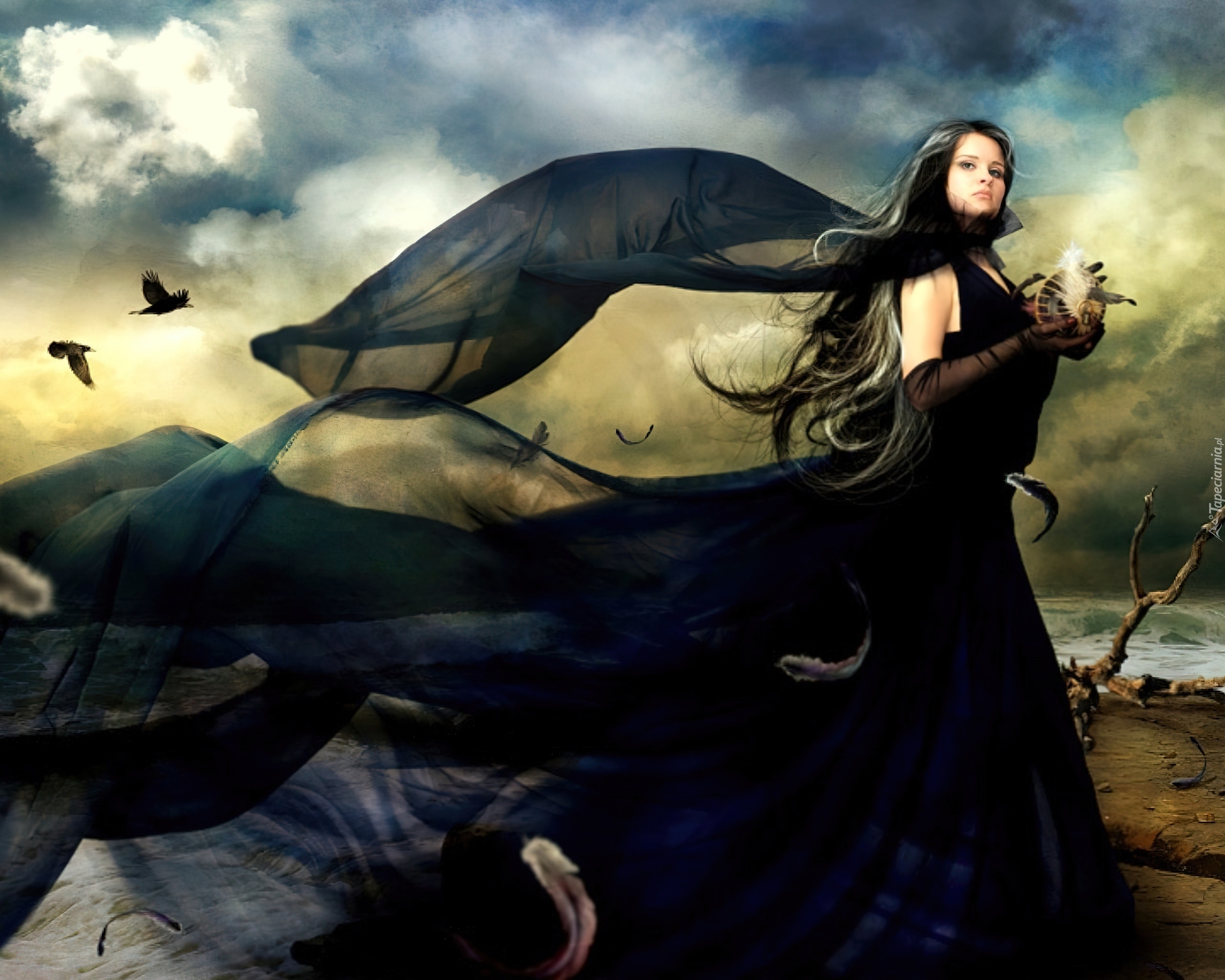 Edytor tapety: Kobieta, Czarna, Suknia, Ptak