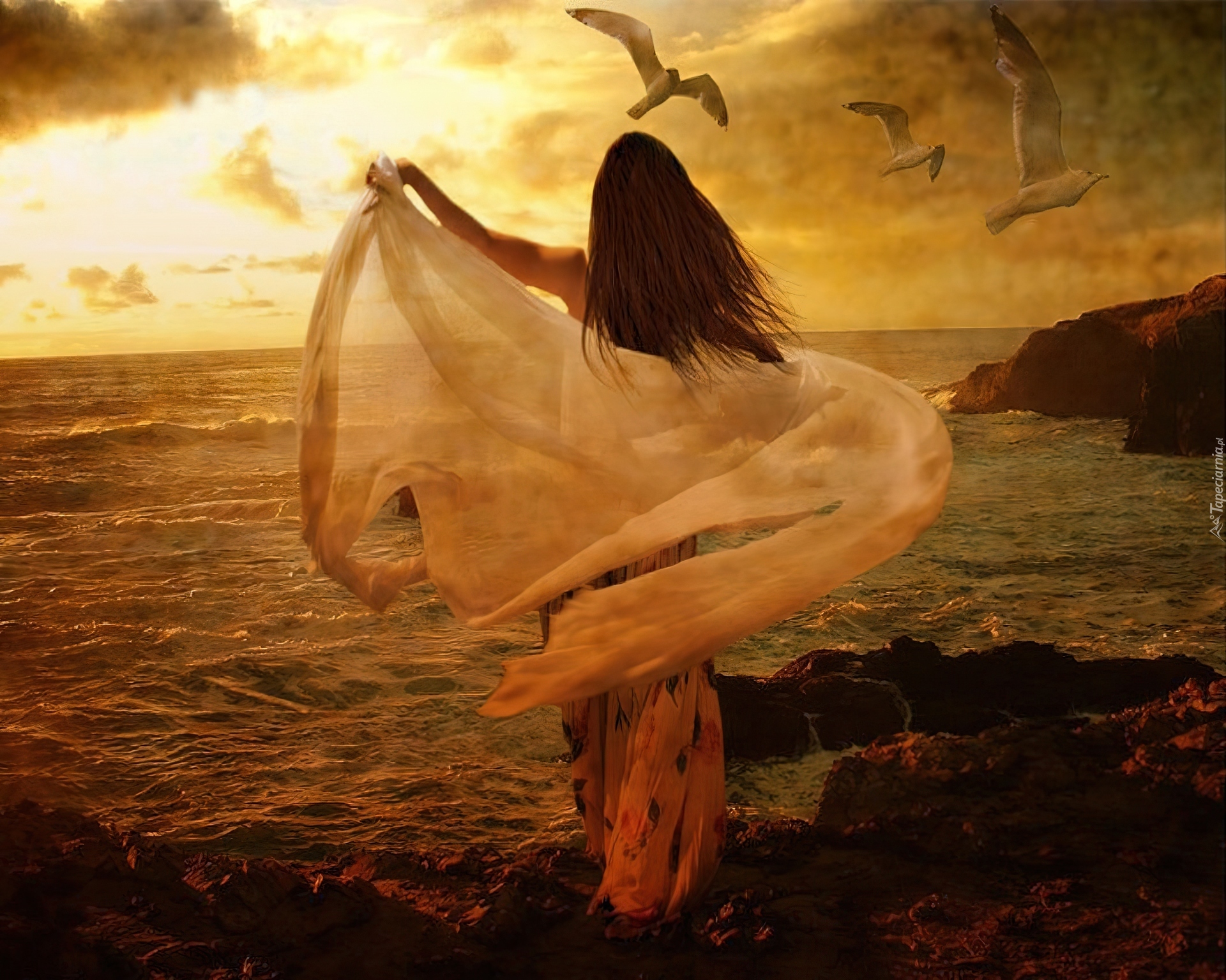 Edytor tapety: Kobieta, Morze, Ptaki