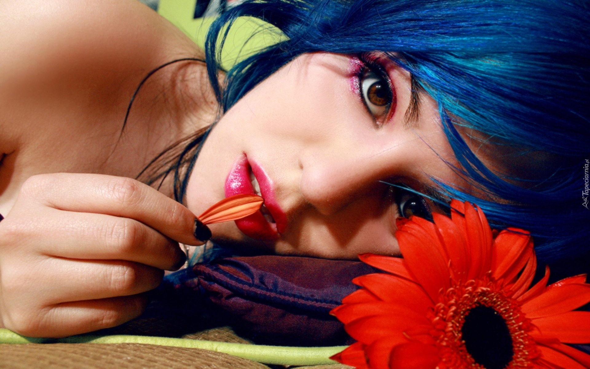 Edytor tapety: Twarz, Niebieskie, Włosy, Kwiat