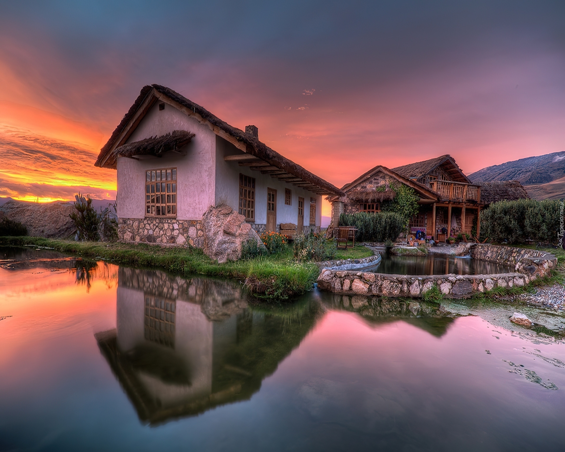 Edytor tapety: Dom, Jezioro, Zachód, Słońca