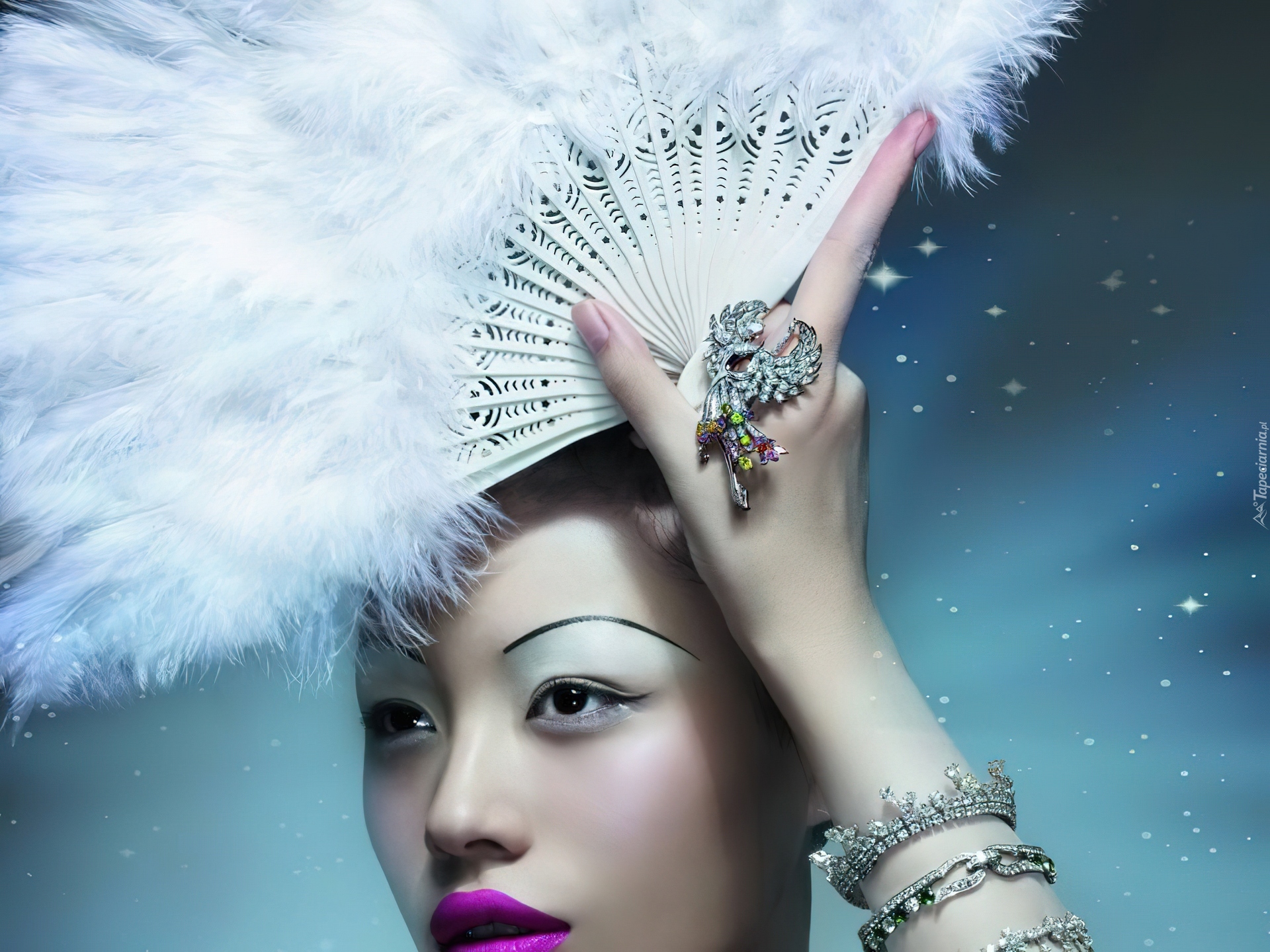 Edytor tapety: Azjatka, Wachlarz, Pióra, Różowe, Usta