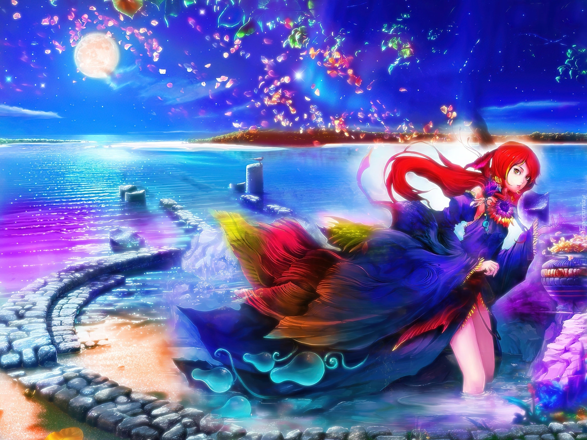 Edytor tapety: Dziewczyna, Woda, Suknia, Płatki