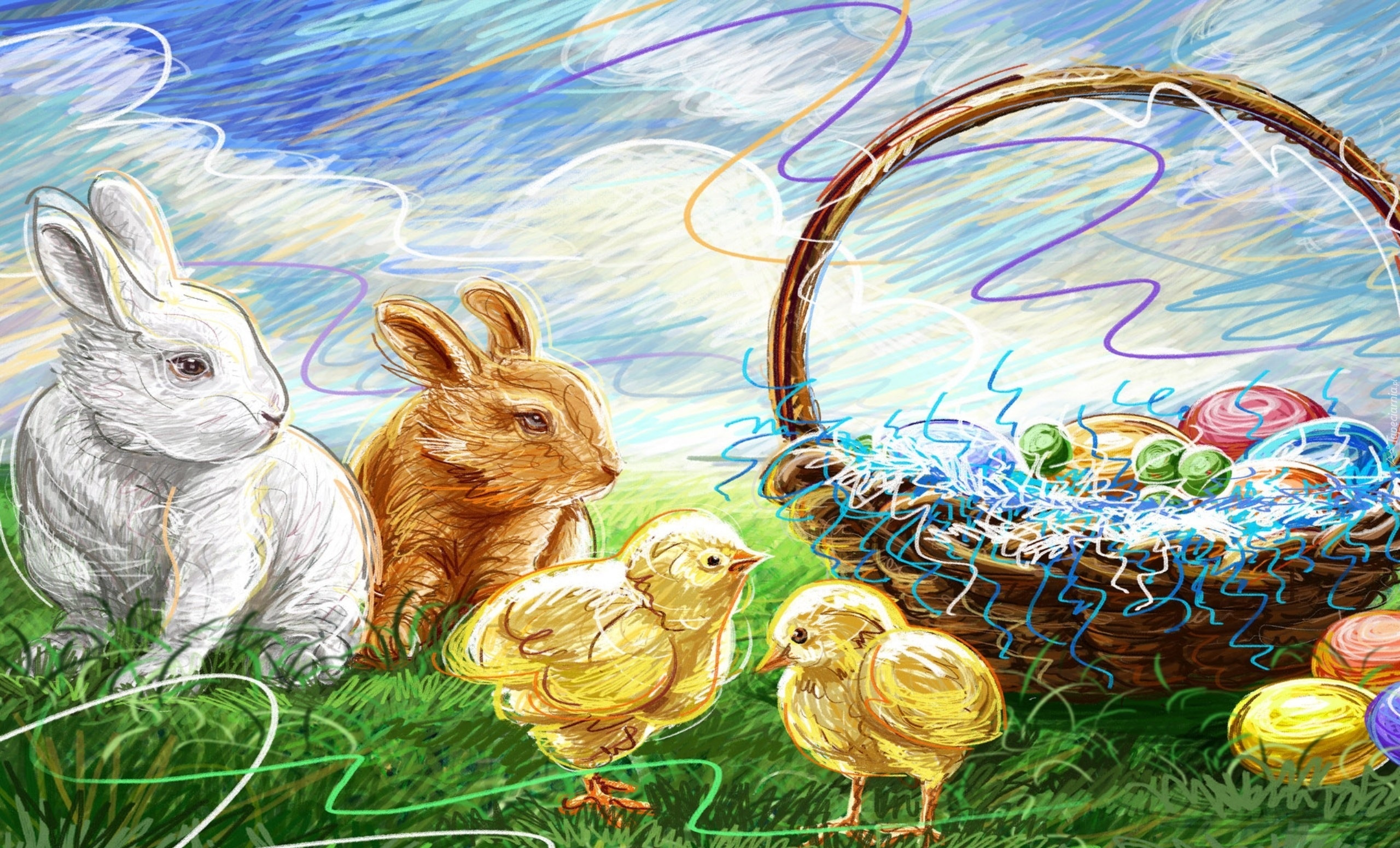 Edytor tapety: Wielkanoc, Zajączki, Kurczaki, Koszyk, Pisanki