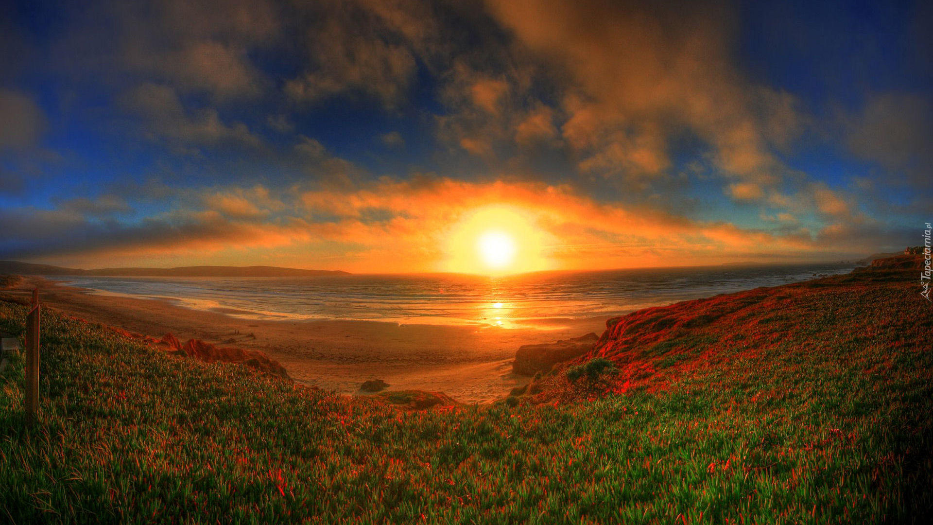 Edytor tapety: Zachód, Słońca, Plaża, Kwiaty