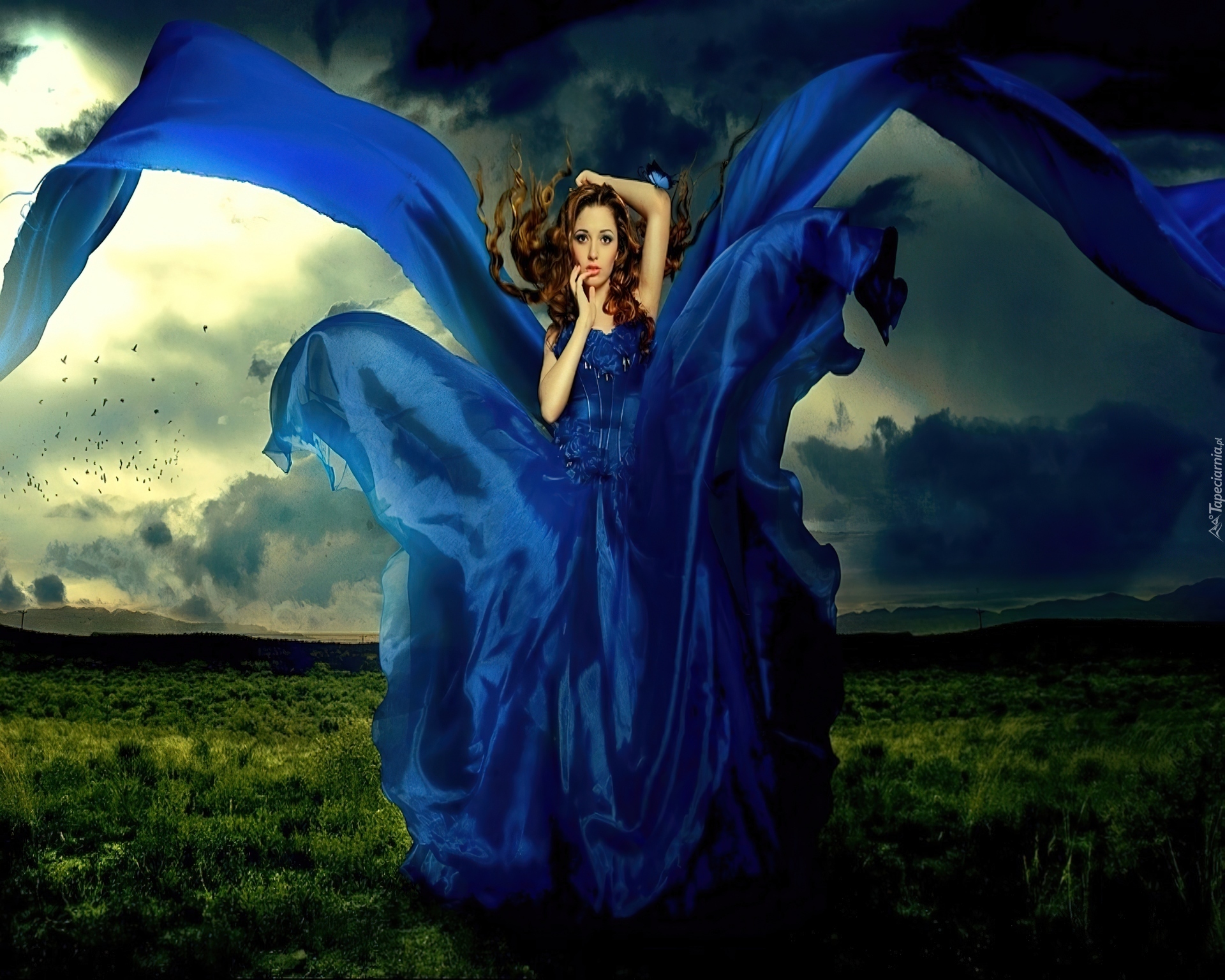 Edytor tapety: Kobieta, Niebieska, Suknia, Wiatr