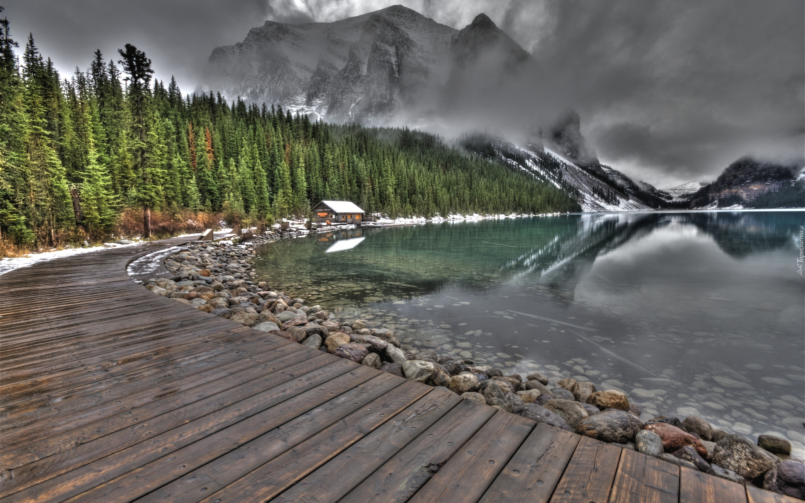 Edytor tapety: Jezioro, Góry, Las, Chmury