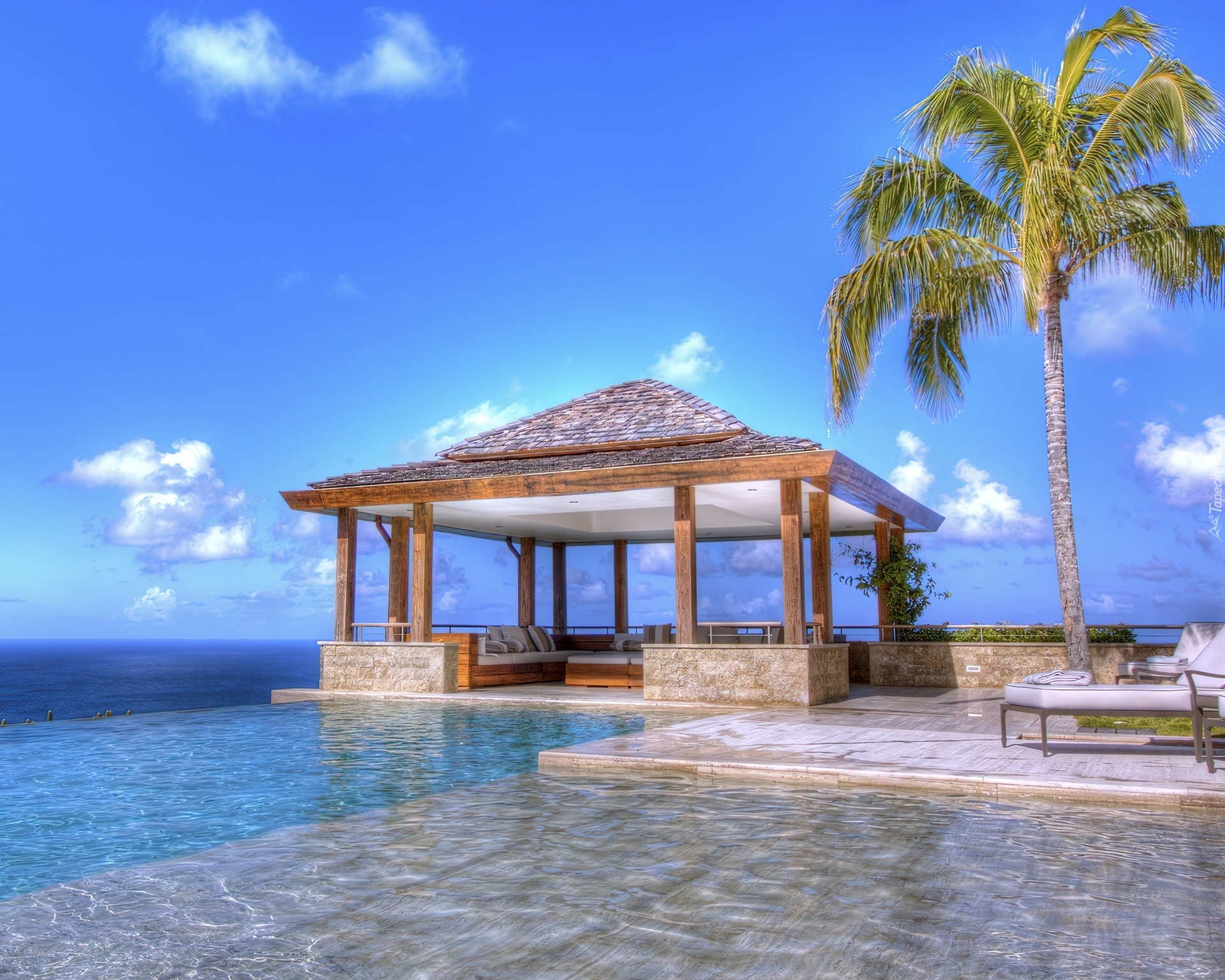 Edytor tapety: Domek, Palma, Morze