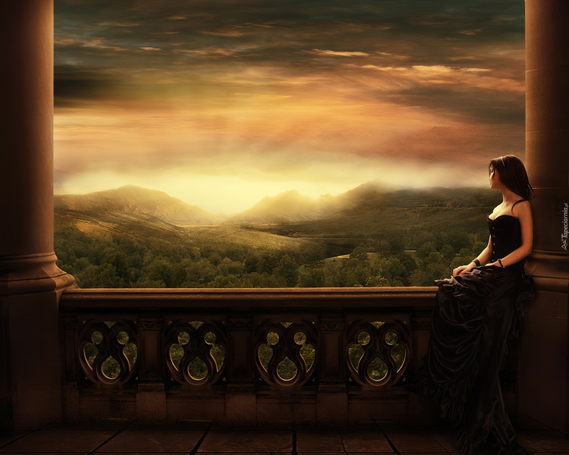 Edytor tapety: Kobieta, Zachód, Słońca, Balkon