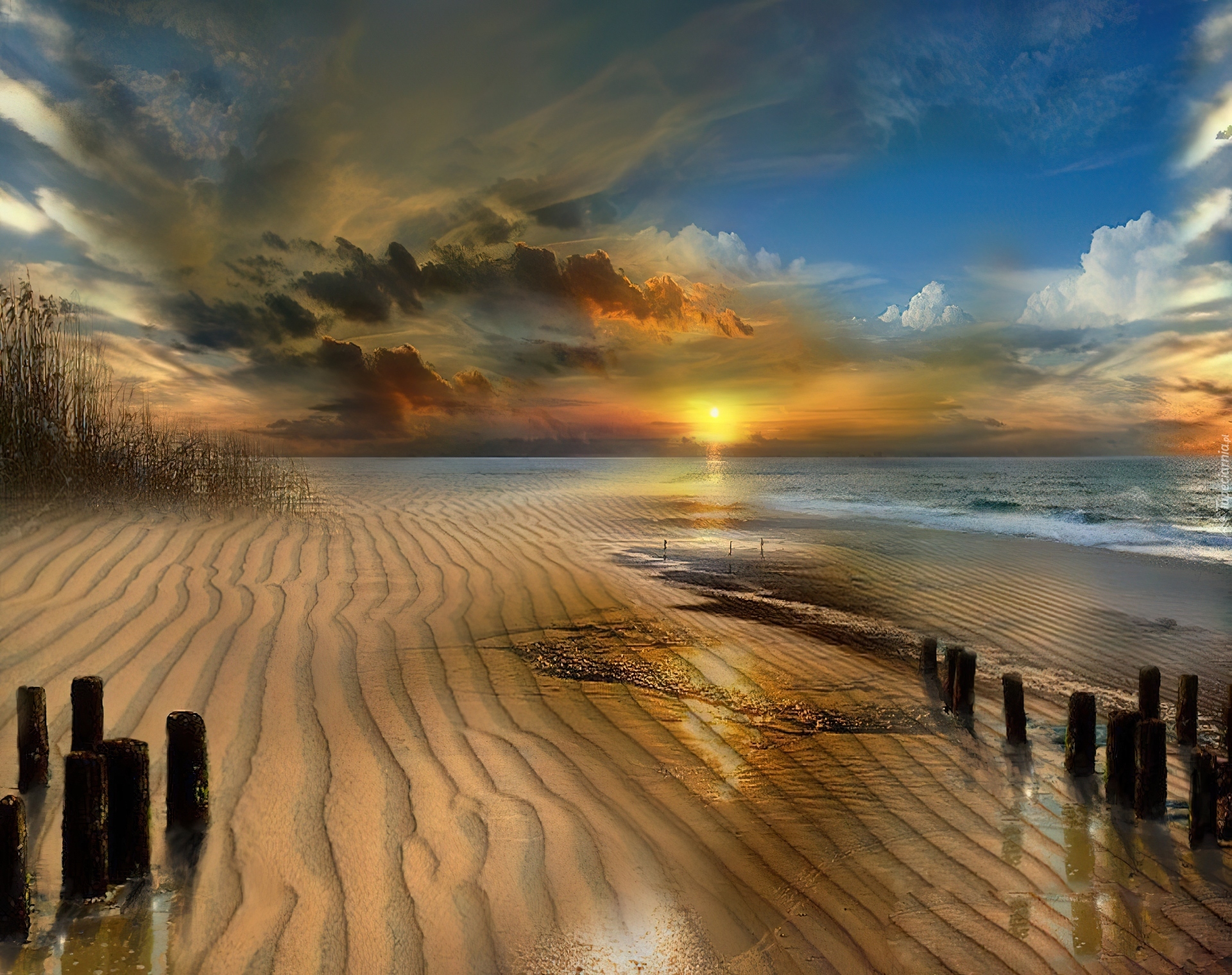 Edytor tapety: Zachód, Słońca, Plaża, Pale