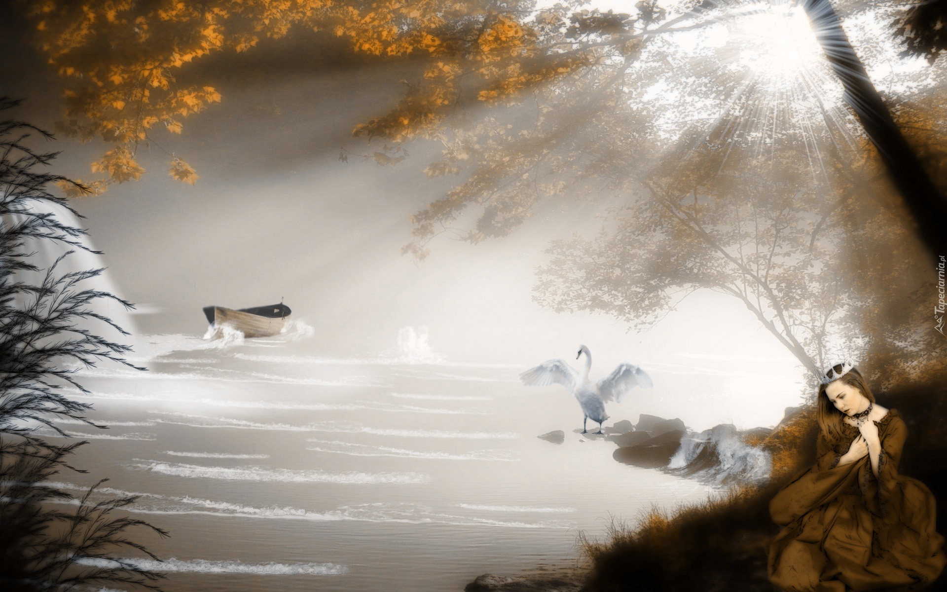 Edytor tapety: Jezioro, Kobieta, Łódka, Jesień, Fantasy