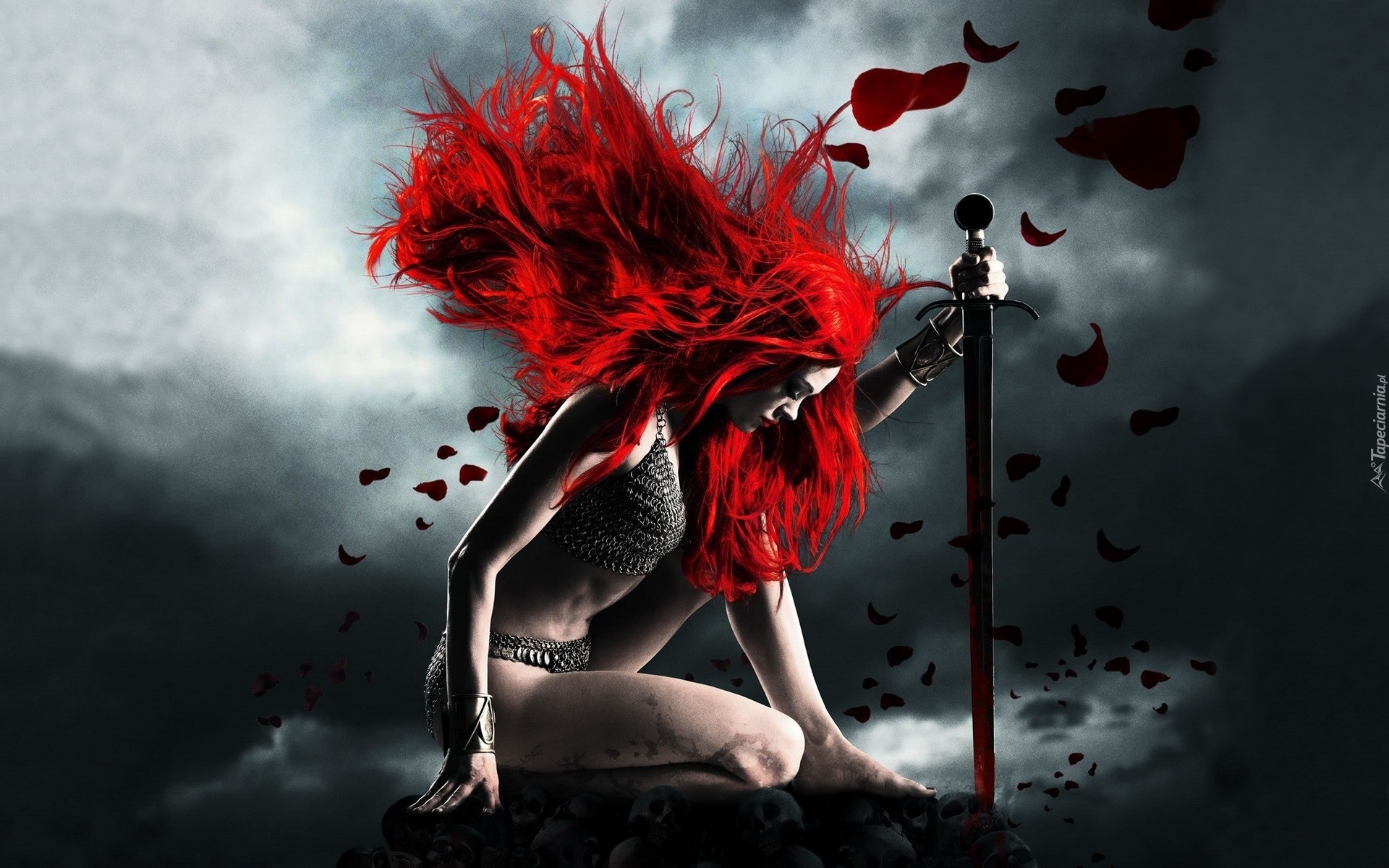 Edytor tapety: Wojowniczka, Czerwone, Włosy, Miecz