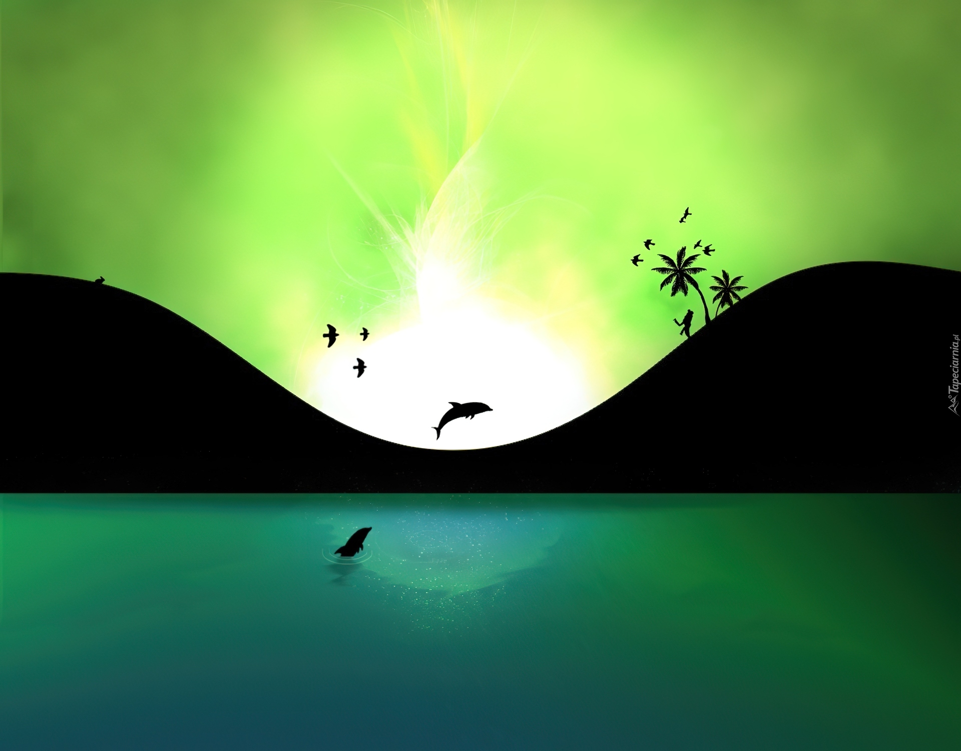 Edytor tapety: Turkusowa, Woda, Delfiny, Zielone, Niebo