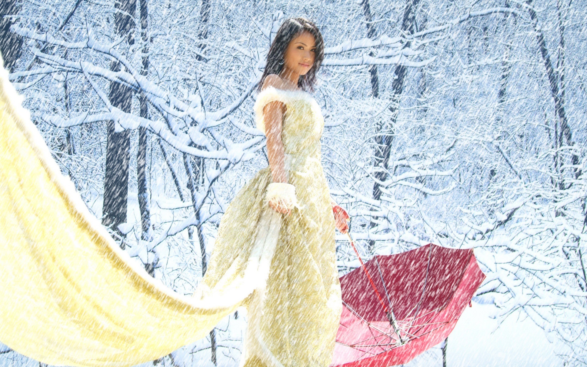 Edytor tapety: Japonka, Śnieg, Parasol, Drzewa