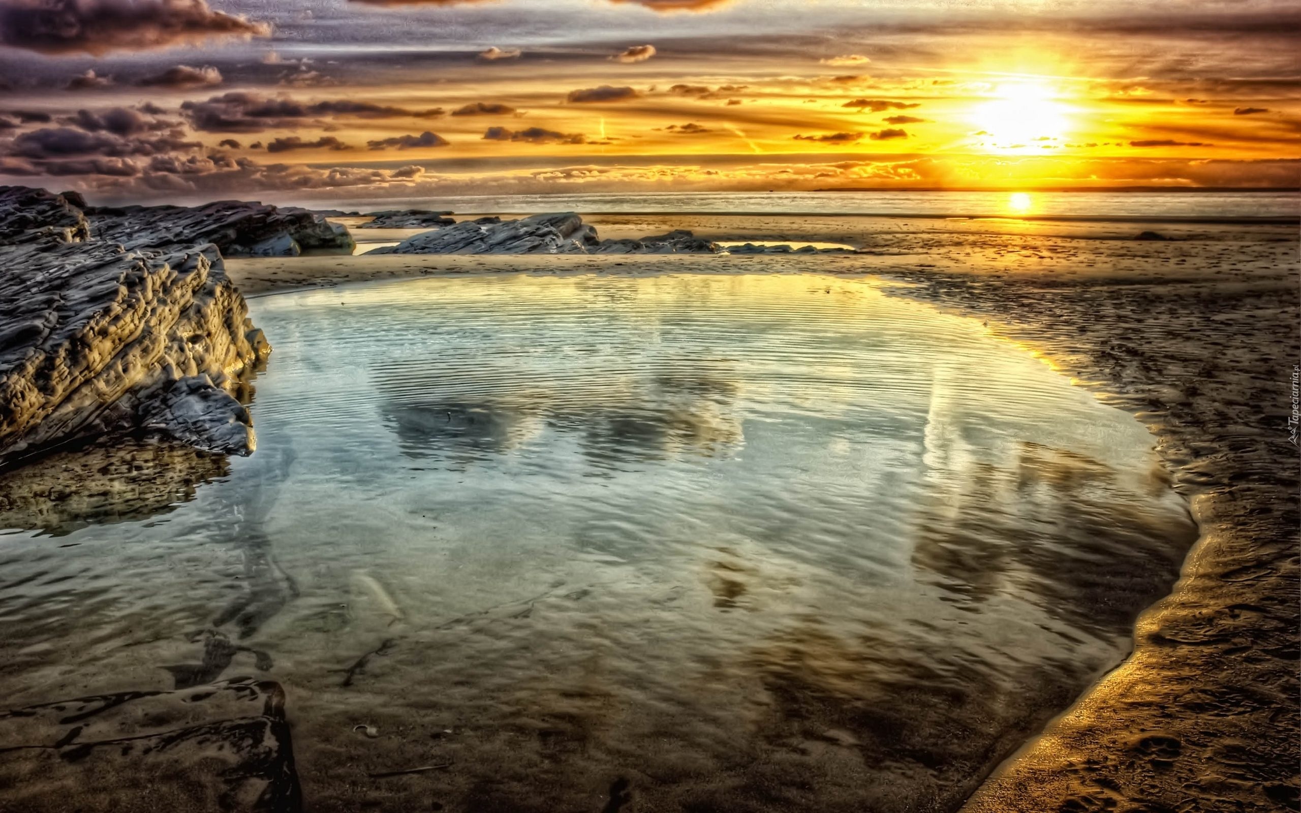 Edytor tapety: Zachód, Słońca, Jezioro, Chmury, Skały