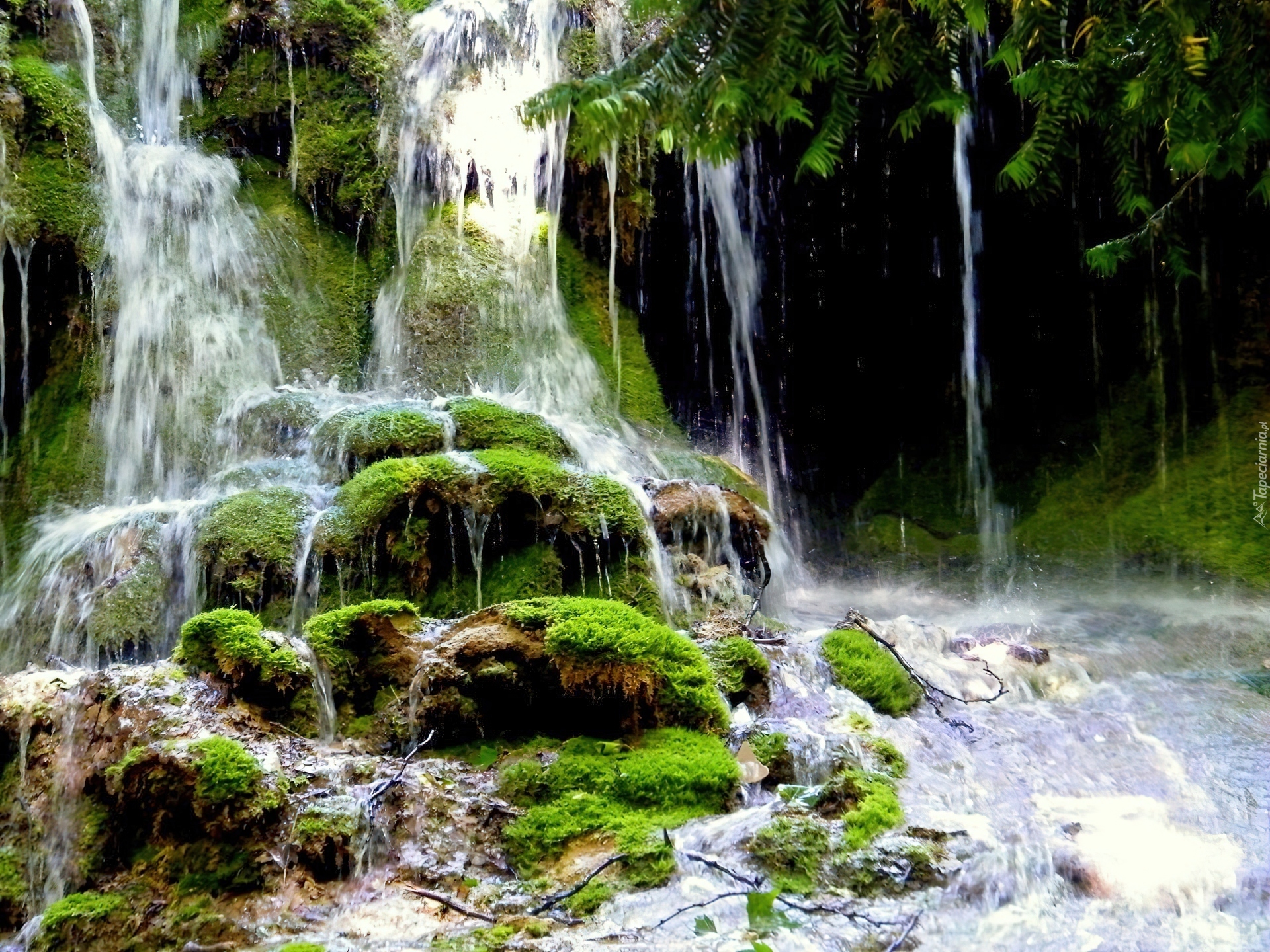 Edytor tapety: Wodospad, Kamienie, Mech
