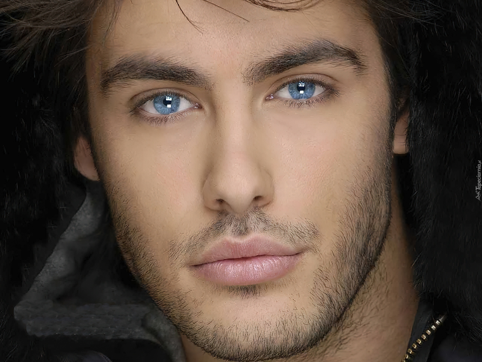 Edytor tapety: Przystojny, Mężczyzna, Brunet, Niebieskie, Oczy, Zarost